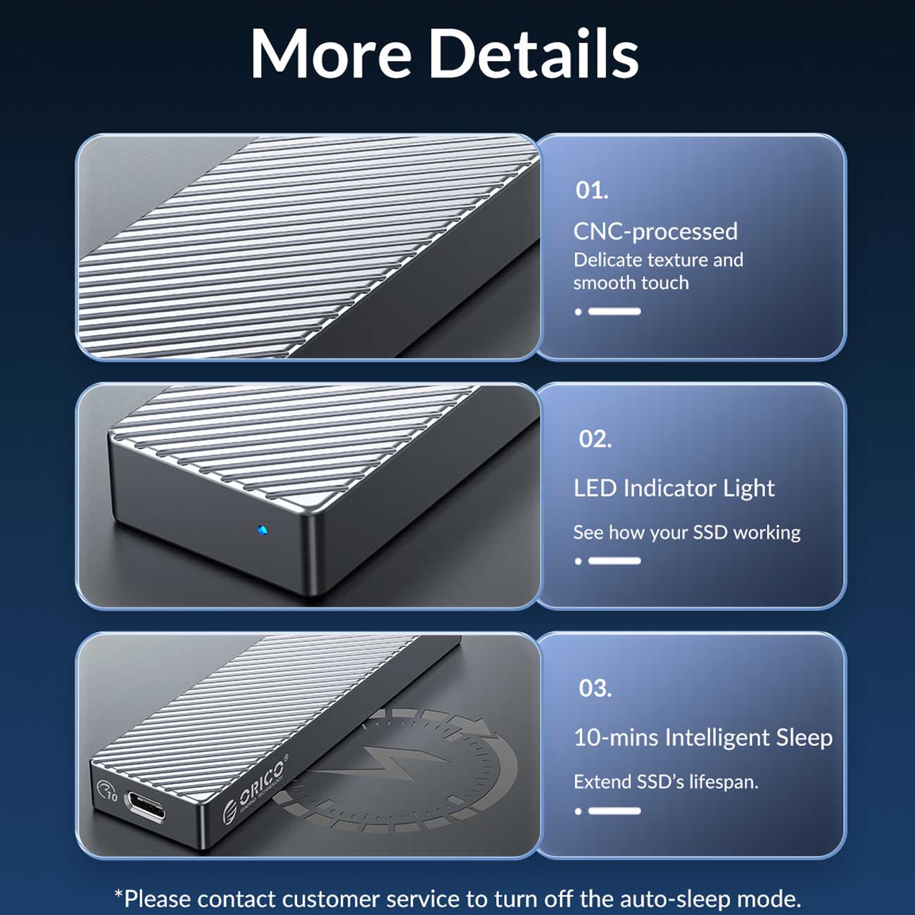 محفظه حافظه خارجی ORICO دارای حالت خواب خودکار 10 دقیقهای است که در صورت عدم استفاده، بهطور خودکار فعال میشود. این ویژگی به افزایش عمر مفید هارد دیسک کمک کرده و از هرگونه آسیب و از بین رفتن داده جلوگیری میکند.