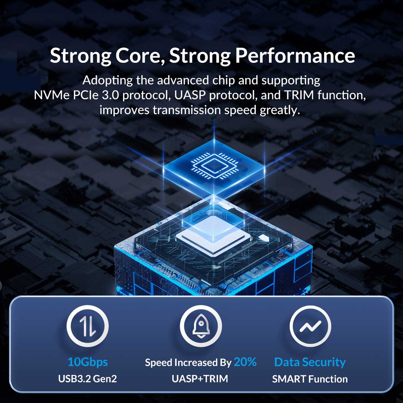 استفاده از تراشه پیشرفته و پشتیبانی از پروتکل NVMe PCLe 3.0، پروتکل UASP و عملکرد TRIM، سرعت انتقال را تا حد زیادی افزایش میدهد. یکی دیگر از ویژگیهای این محصول اوریکو ظرفیت بالای آن است؛ این مبدل تا حداکثر 4 ترابایت را پشتیبانی میکند.