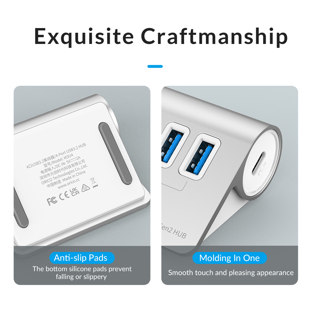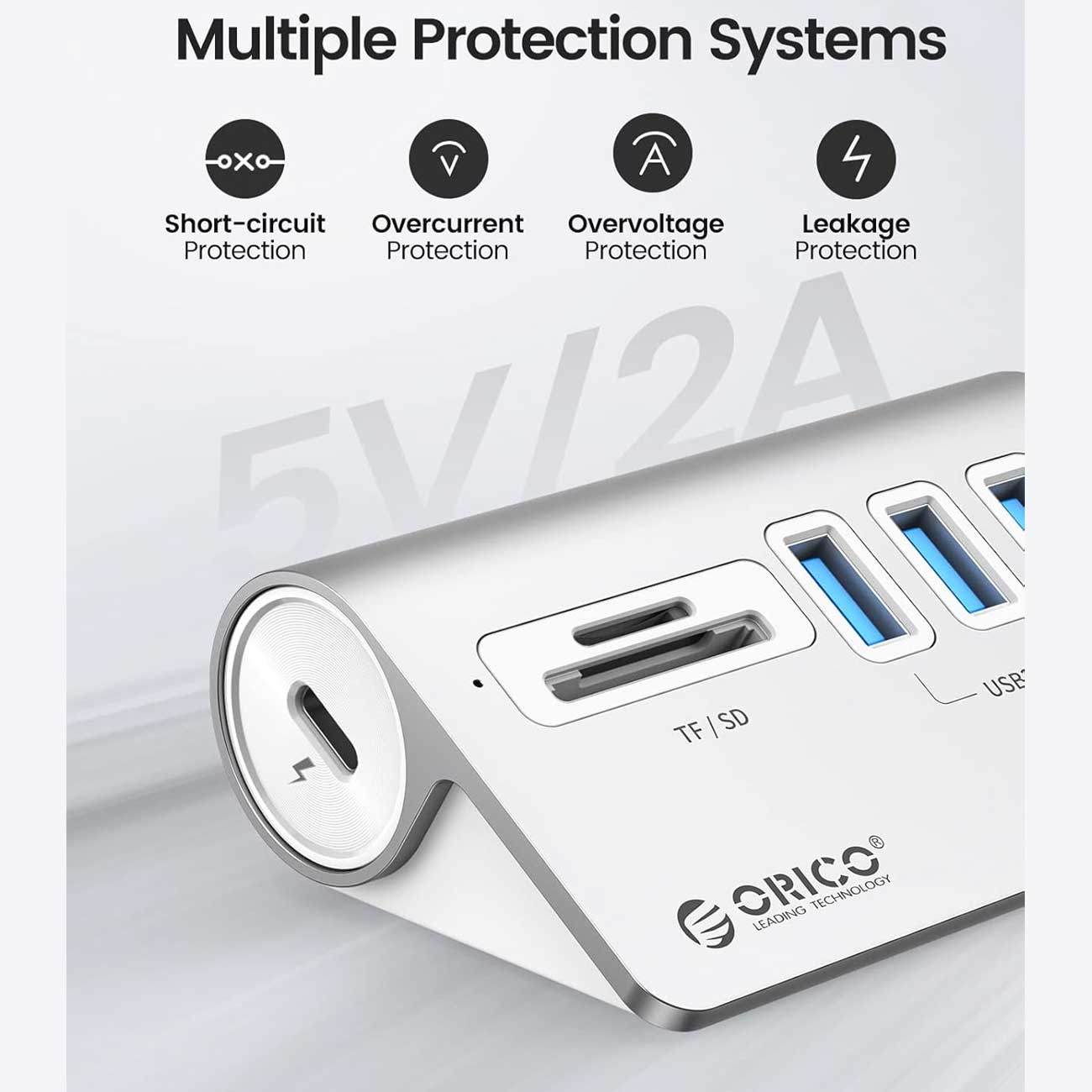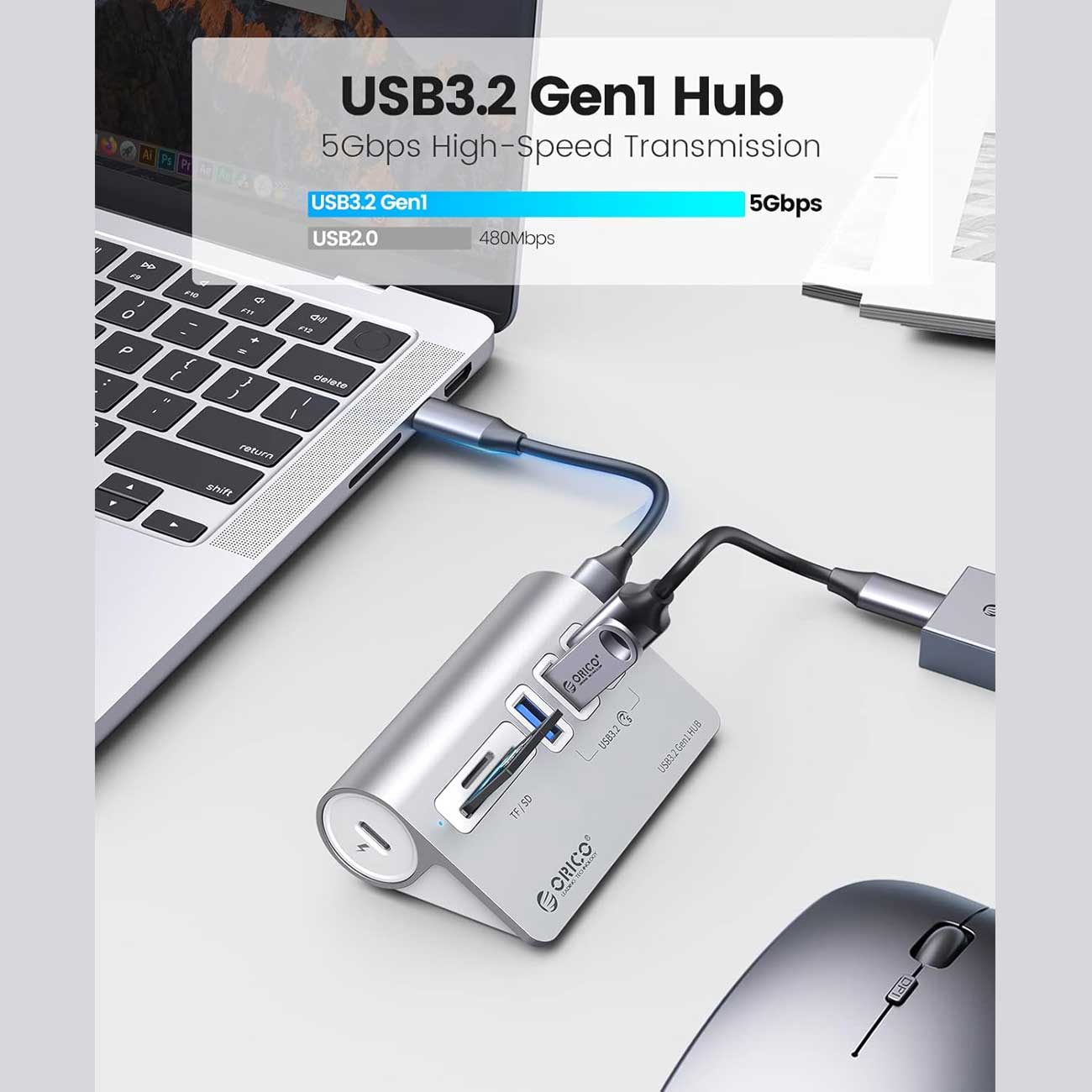هاب آلومینیومی ORICO USB 3.2 دارای رابط منبع تغذیه تایپ سی 5 ولتی رزرو شده، می تواند منبع تغذیه خارجی 5 ولت 2 آمپری باشد تا از عملکرد عادی دستگاه های USB پرقدرت اطمینان حاصل کند؛ (این بسته محصول شامل آداپتور برق نمیشود).