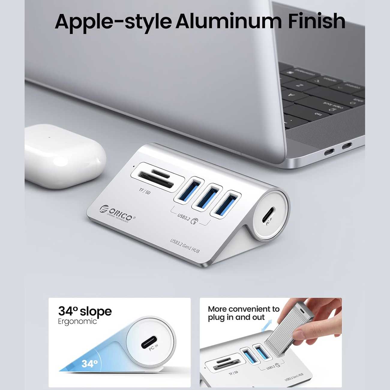 هاب USB 3.2 ایده آل برای Mac Pro، iMac، MacBook Air، MacBook Pro، MacBook و Mac mini میباشد. طراحی شیب منحصر به فرد 34 درجه، ارگونومیک مطابق با راحت ترین حالت بدن انسان بوده، تجهیزات را به راحتی وصل کنید و بازی کنید. ساخت نفیس همراه با بافت فوق العاده به شما این امکان را میدهد که کیفیت عالی محصول را در حین لذت بردن از انتقال داده تجربه کنید. ساخته شده با آلیاژ آلومینیوم، سطح آنودایز شده، کمک بیشتری به دفع گرما میکند.