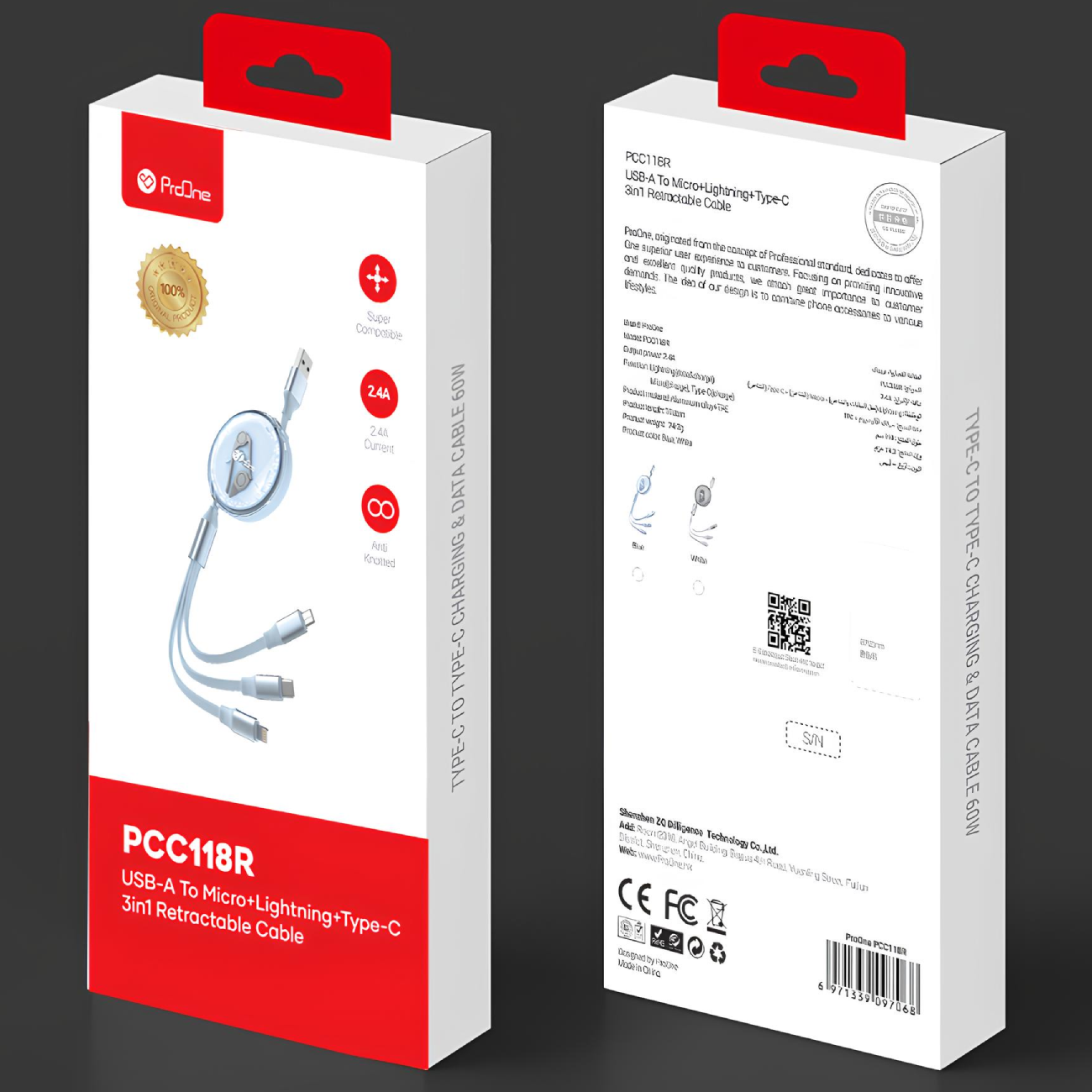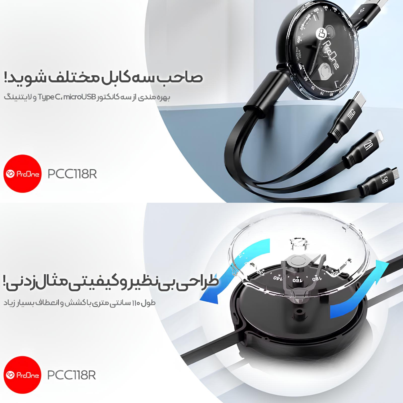 کابل چندمنظوره جمعشو ProOne PCC118R با طراحی منحصربهفرد و قابلیتهای پیشرفته، انتخابی ایدهآل برای کاربران حرفهای است. کانکتور لایتنینگ آن علاوه بر شارژ سریع با شدت جریان 2 آمپر، امکان انتقال دادهها با سرعت 480 مگابیت بر ثانیه را فراهم میکند. کانکتور Type-C با پشتیبانی از شدت جریان 6 آمپر، برای دستگاههای مدرن و پرمصرف، عملکردی بینظیر ارائه میدهد و کانکتور microUSB نیز با شدت جریان 2 آمپر، برای دستگاههای قدیمیتر مناسب است. این کابل همهکاره، ترکیبی از کارایی، دوام و نوآوری در یک طراحی جذاب است.