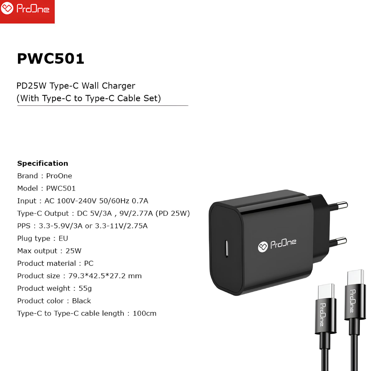 شارژر Proone PWC501 به همراه یک کابل تایپسی به تایپسی فست شارژ با کانتکورهایی از جنس آلیاژ آلومینیوم و روکش پلاستیکی با طول 1 متری، مقاوم در برابر کشش، خمیدگی و پارگی است.