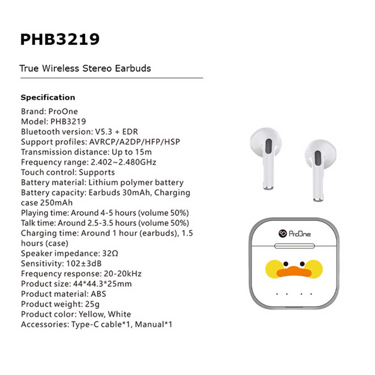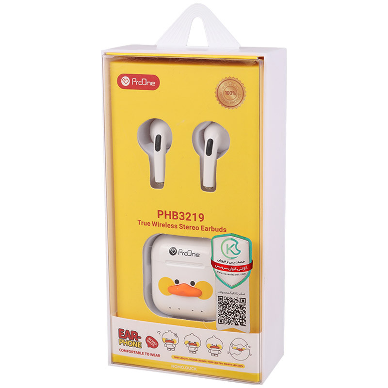 علاوه بر کیفیت صدا و قابلیت مکالمه با کیفیت، زمان پخش طولانی و زمان شارژ کوتاه در کنار طراحی متفاوت از عوامل اصلی برای خرید هندزفری بلوتوثی هستند؛ با ProOne PHB3219 Wireless Earbuds که دارای یک طراحی عروسکی است؛ نه تنها به موسیقی مورد علاقه خود گوش می دهید از باکس عروسکی در رنگ های سفید و زرد محصول نیز لذت ببرید. ProOne PHB3219 صدایی با وضوح بالا ارائه می دهد. واضح است که تمام این جزئیات به شما کمک خواهد کرد یک تجربه شنیداری لذت بخش داشته باشید.