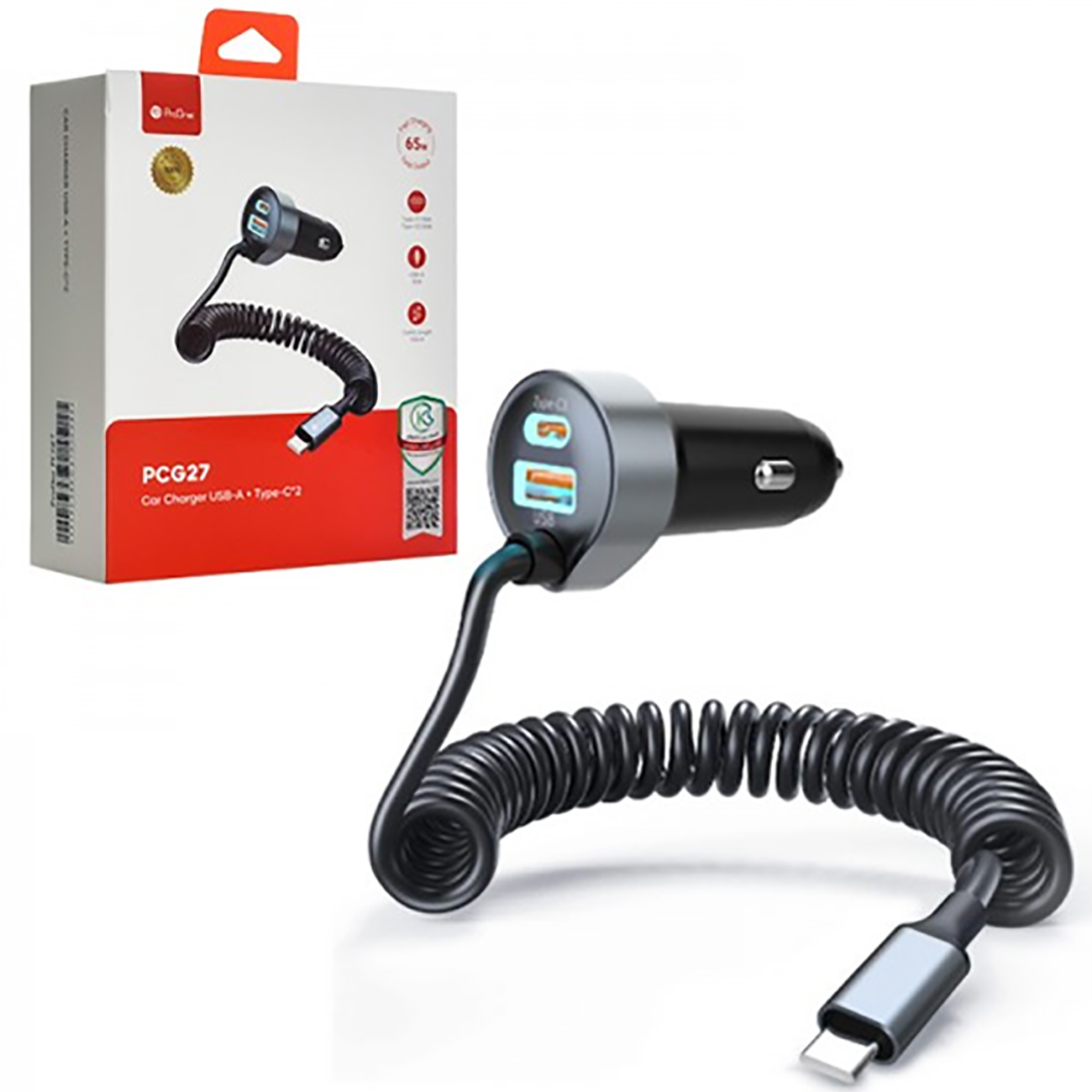 شارژر فندکی پرووان ProOne PCG27 CAR CHARGER USB-A + TYPE-C*2 با داشتن دو درگاه خروجی یو اس بی و تایپ سی و یک کابل شارژر تایپ سی امکان شارژ همزمان سه دستگاه را با حداکثر توان خروجی 65 وات برایتان فراهم میکند.