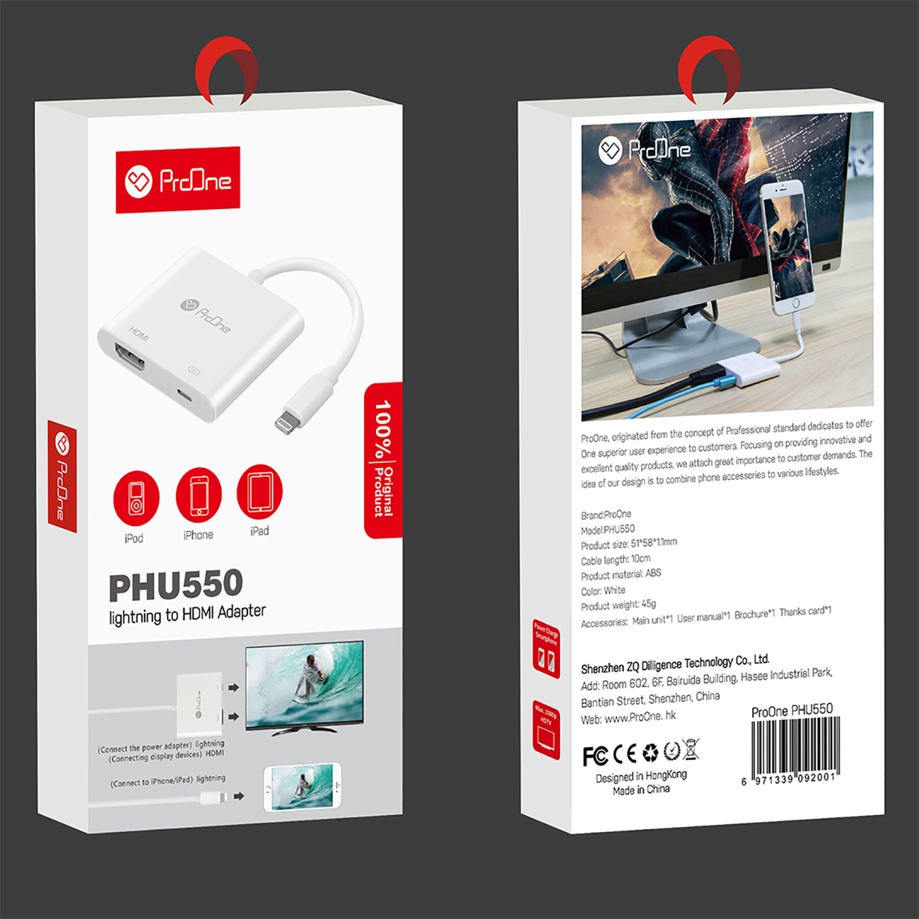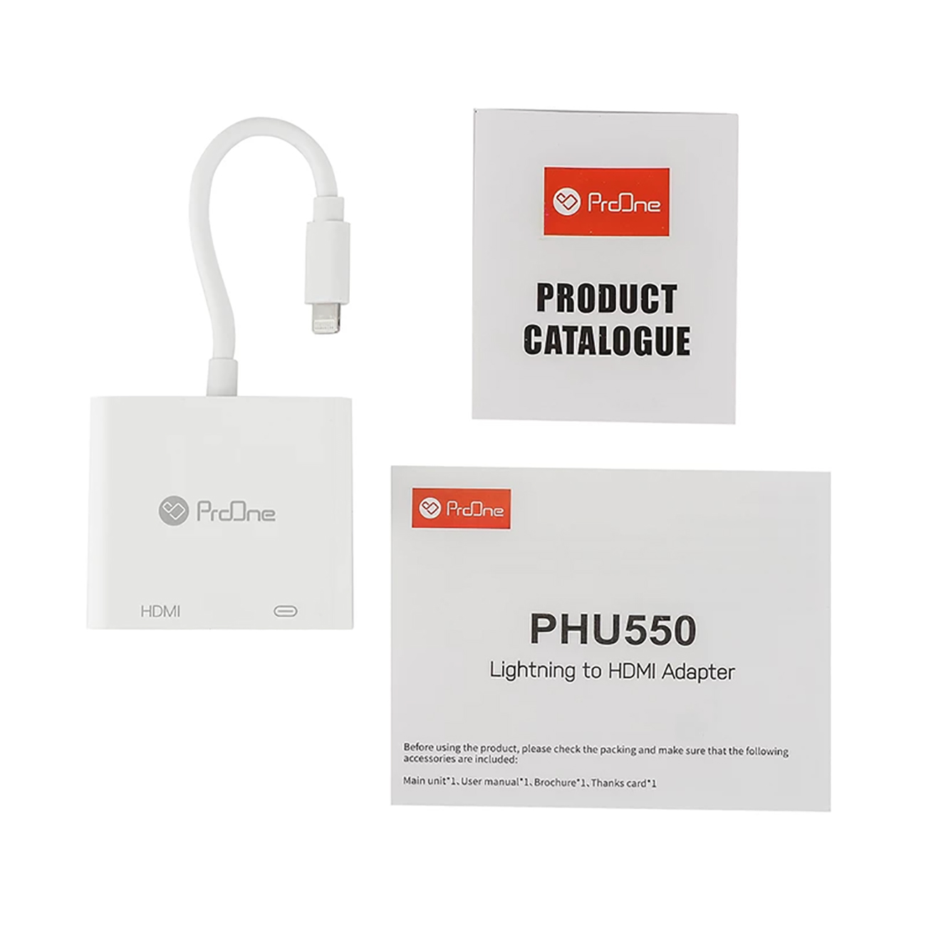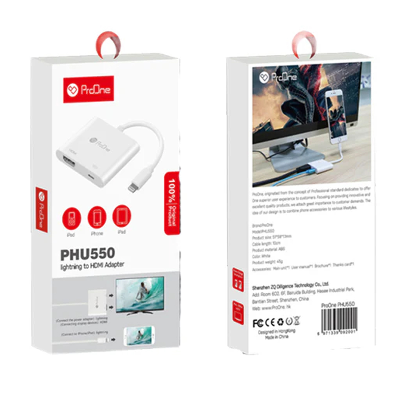 مبدل پروان proone PHU550 Lightning to HDMI Adapter قابل اتصال به آداپتور برق ( لایتنینگ)، دستگاه نمایشگر( اچ دی ام آی) و اتصال به آیفون و آیپد میباشد.