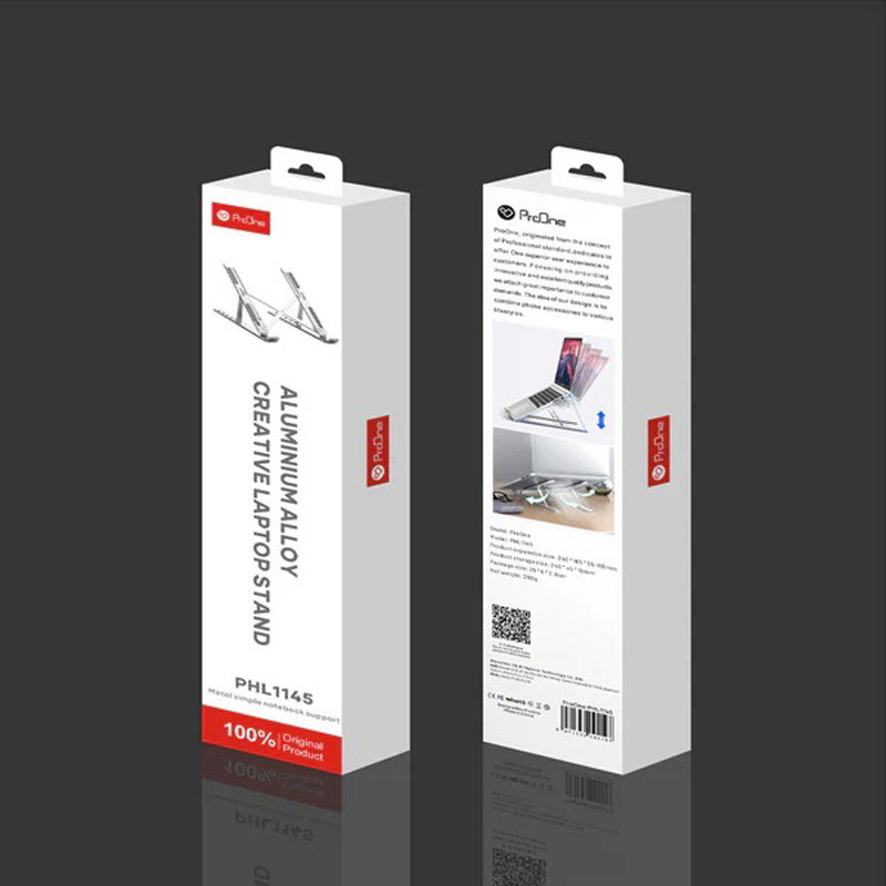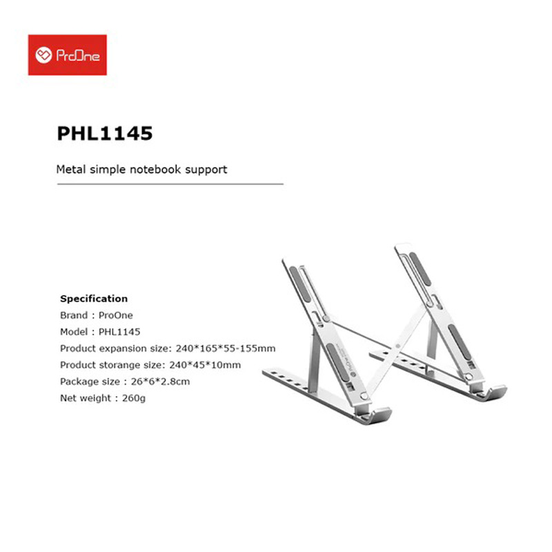 بدنه ProOne PHL1145 از جنس آلیاژ آلومنیوم بسیار سبک و به وزن 260 گرم ساخته شده است. این پایه قابلیت جمعشدن دارد و بازوی های آن به صورت متحرکی ساخته شده. به لطف بالشتک های سیلیکونی مک بوک و لپ تاپ شما را در برابر خط و خش ناشی از برخورد فلز محافظت می نماید. همراه استند یک ساک حمل نیز برای حمل آسان قرار داده شده است.