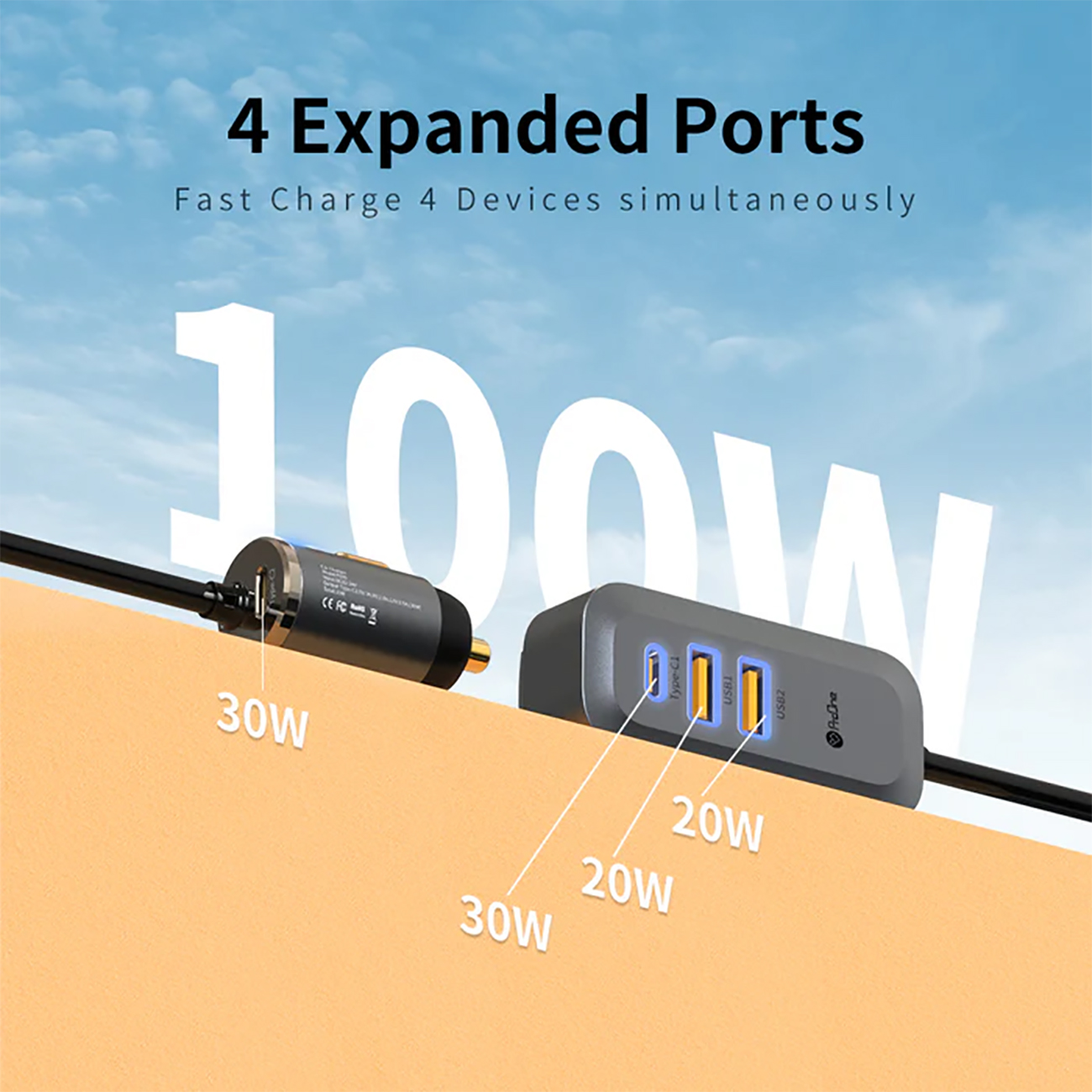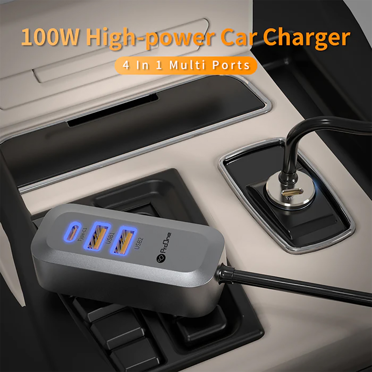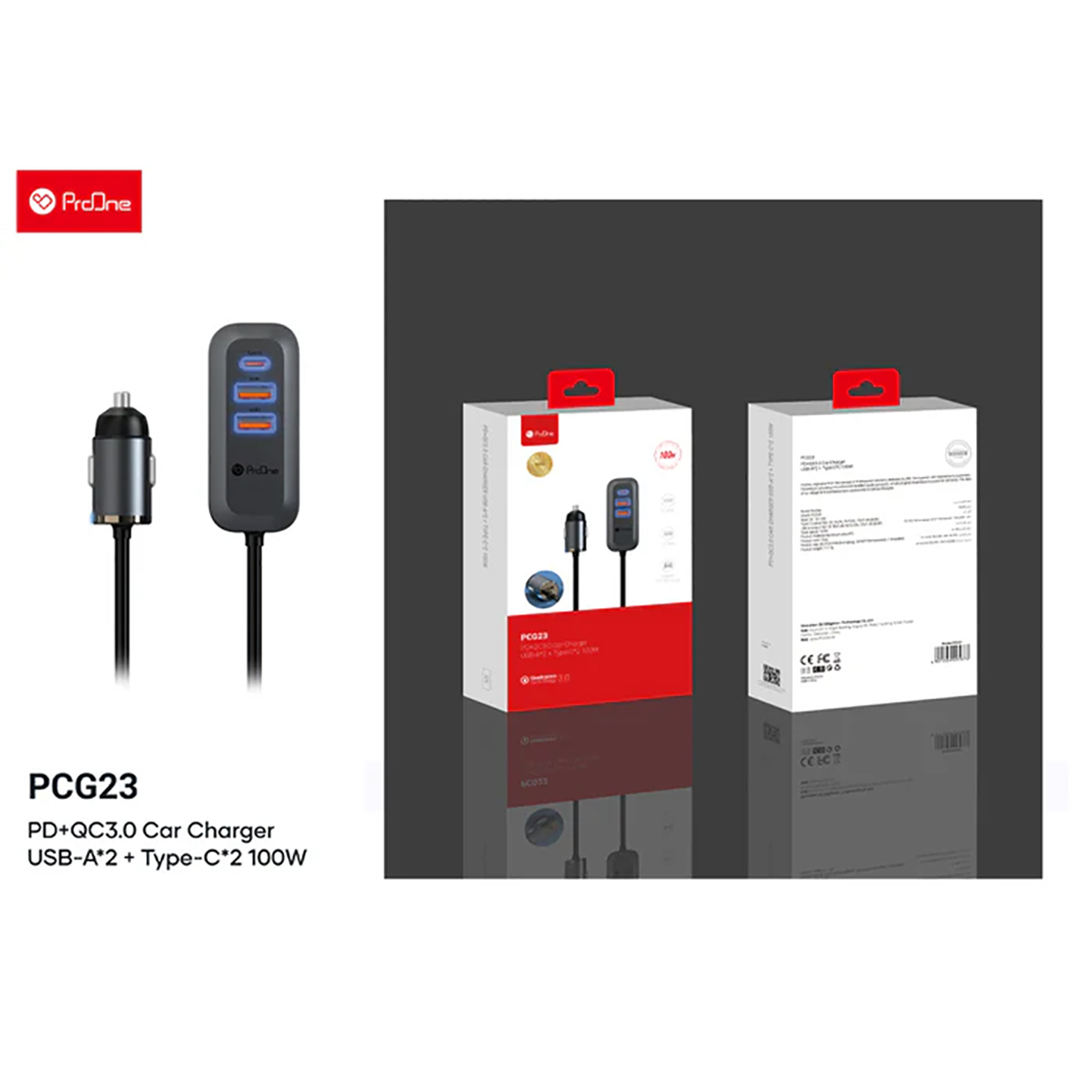 شارژر موبایل داخل ماشین ProOne PCG23 Car Charge دارای دو خروجی تایپ سی و دو خروجی یو اس بی با حداکثر توان خروجی 100 وات است و امکان اتصال چهار دستگاه همزمان جهت شارژ با قابلیت شارژ سریع PD را فراهم میکند.
