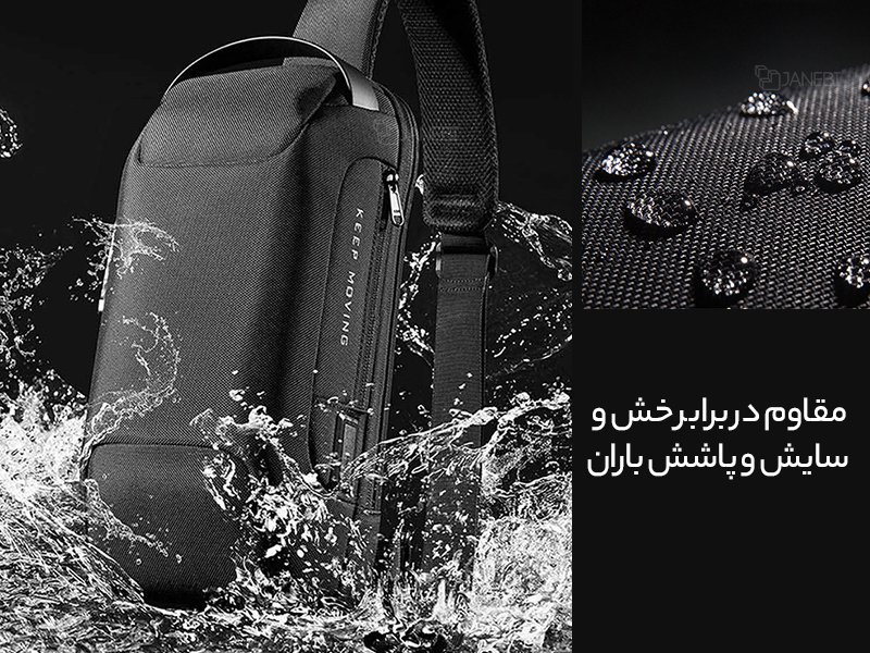 کیف کراس بادی ضد سرقت BANGE دارای پورت شارژ USB مدل 22085 از مواد باکیفیت آکسفورد و مواد ضد قطره با چگالی بالا دافع آب و ضد نفوذ تولید شده است. متد به کار رفته در این کوله آن را در برابر خش و سایش و پاشش باران سبک مقاوم کرده است. این ویژگی ها موجب می شود تا شما با خیال راحت آن را در هر نوع شرایط آب و هوایی استفاده نمایید.