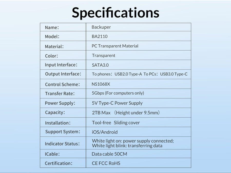 | مشخصات پشتیبان گیر 2.5 اینچ اوریکو ORICO BA2110 Backuper | |