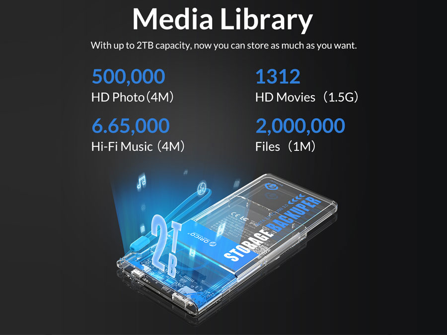 یکی دیگر از ویژگیهای بکاپ گیر حافظه موبایل اوریکو ظرفیت بالای آن است؛ این مبدل تا 2 ترا بایت را پشتیبانی میکند. با قرار دادن هارد 2 ترابایت امکان ذخیره اطلاعات با حجم بالا را برایتان فراهم کرده و میتوانید 500000 عکس، 1312 فیلم HD و 665000 آهنگ و 2000000 فایل 1M را ذخیره کنید.