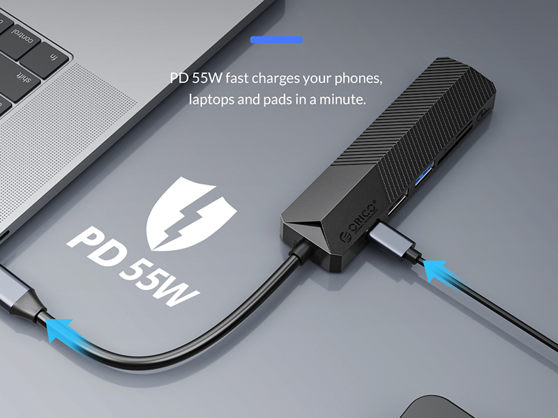 هاب آداپتور تایپ سی قابل حمل اوریکو با کابل 11 سانتی متری مدل MDK-4P با توان 55 وات قابلیت شارژ سریع گوشی ها، لپ تاپ ها و پدهای شما را دارد و فقط آنها را در یک دقیقه شارژ می کند.