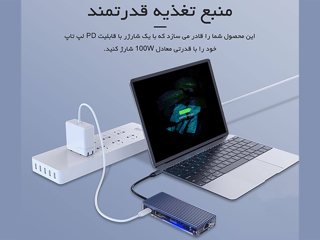 این هاب Type-C شما را قادر میسازد که با یک شارژر با قابلیت PD لپ تاپ خود را با قدرتی معادل 100W شارژ کنید