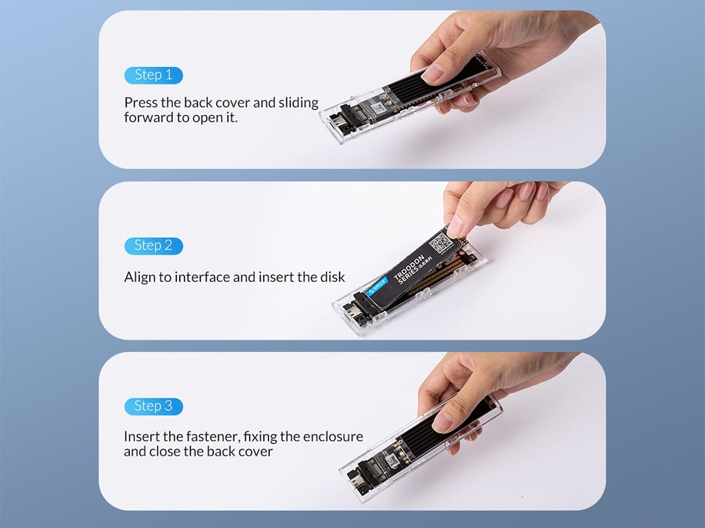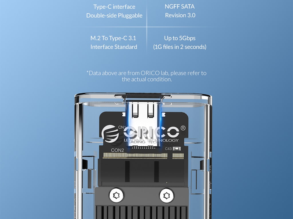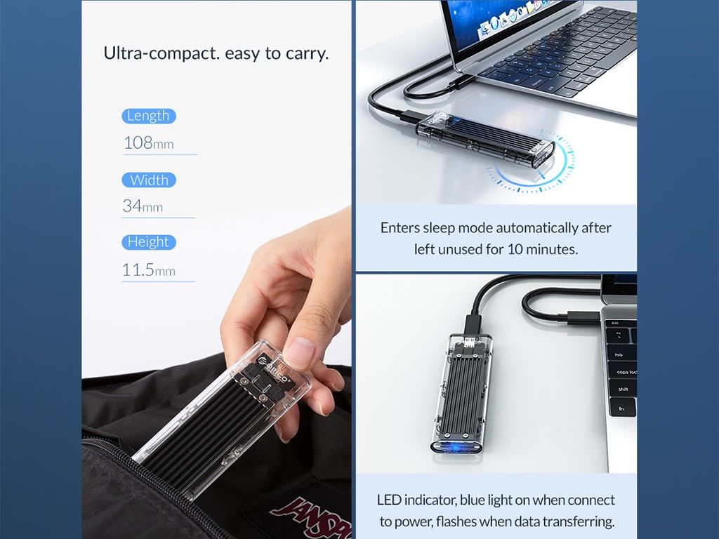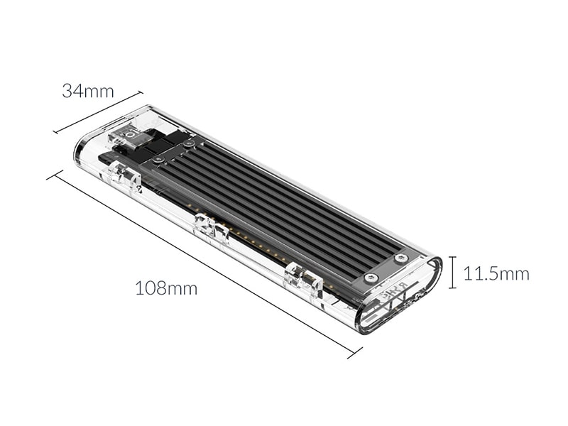 قاب شفاف منحصر به فرد با صفحه آلومینیوم پلیکروم باعـث می شود تکنولوژی داخل را ببینید. باکس درایو اس اس دی اوریکو ORICO TCM2F-C3-BK-BP NGFF M.2 دارای ابعاد 34*11.5*108 میلی متر می باشد که حاکی از ابعاد جمع و جور آن است.