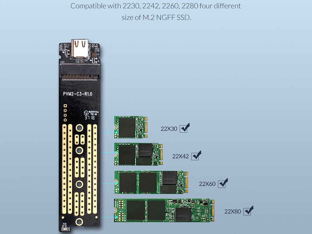 همه اندازه پشتیبانی می کند سازگار با 2230 ، 2242 ، 2260 ، 2280 چهار اندازه مختلف M.2 NGFF SSD.