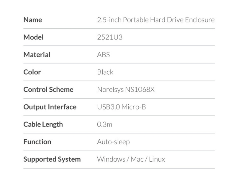 باکس هارد درایو 2.5 اینچی اوریکو Orico 2521U3 از درایو های SSD و هارد از سایز 7 الی 9.5 میلیمتر با رابط SATA پشتیبانی می کند.