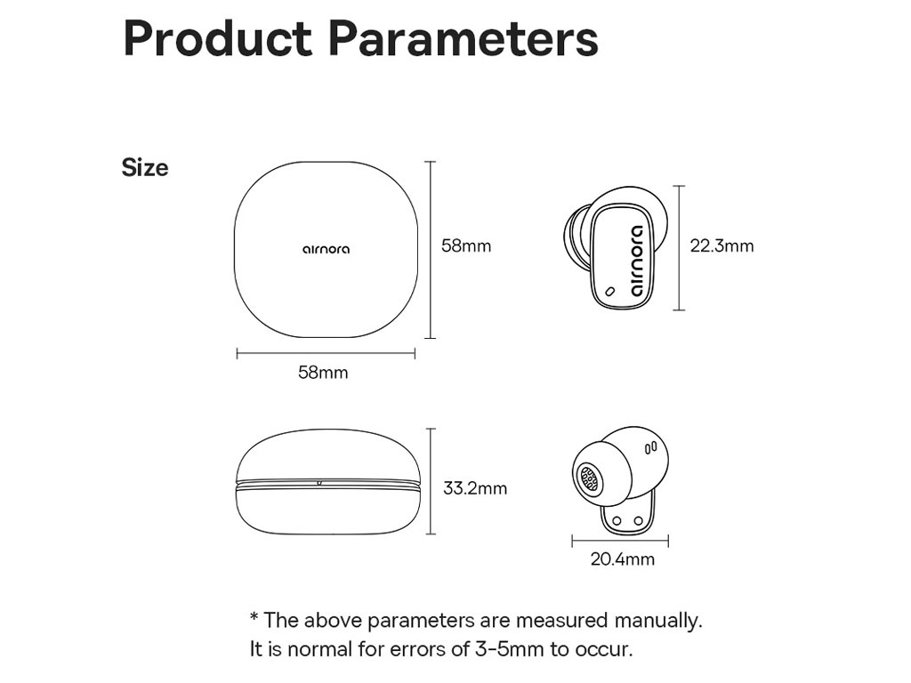 | ابعاد | کیس شارژ: 58*58*33.2 میلیمترگوشیها: 22.3*2.4 میلیمتر |
