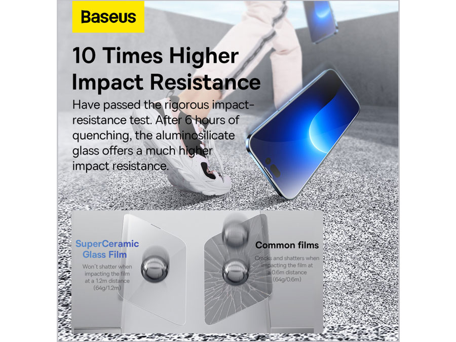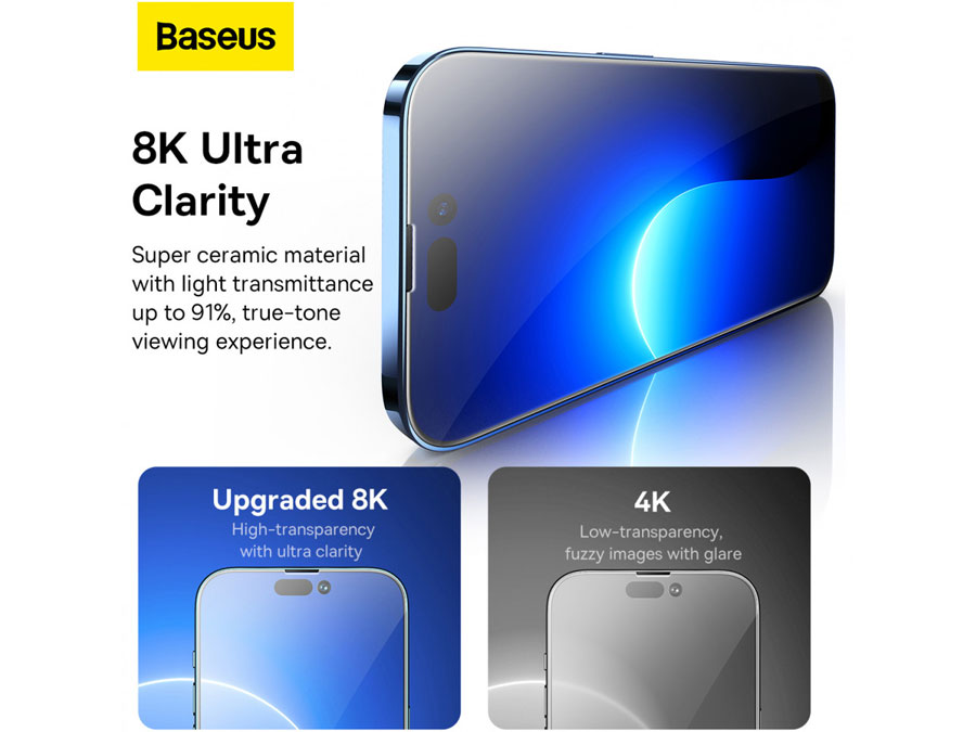 گلس آیفون 14 پرومکس / پلاس بیسوس از شیشه سکوریت ساخته شده و فوقالعاده نازک و شفاف است. ضخامت 0.3 میلیمتری آن قدرت لمس آن را بالا برده و واکنش سریعی به لمس را دریافت خواهید کرد. در عین ظرافت بسیار بالا در مقابل خط و خش و شکستگی بسیار مقاوم عمل کرده و تصاویر را با وضوح 8K به نمایش میگذارد.