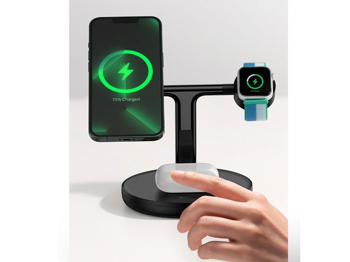 جایگاهی برای شارژ باتری موبایل و ساعت هوشمند در بخش بالایی و جایگاهی هم برای شارژ هندزفری در بخش پایین آن طراحی شده؛ از این بخش برای شارژ موبایل هم میتوانید استفاده کنید. طراحی بسیار زیبایی دارد و نمای جذابی به میز میبخشد.
