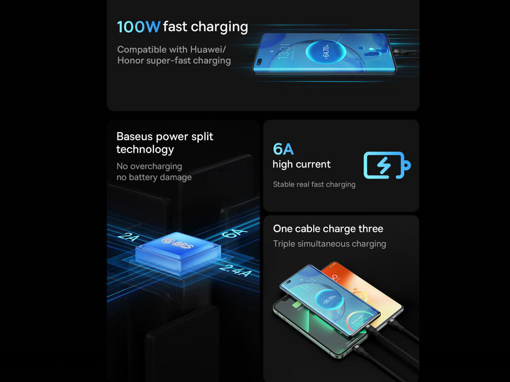 | مشخصات کابل سوپر فست شارژ سه سر یواسبی به میکرو، تایپسی و لایتنینگ 1.2 متر بیسوس Baseus 100W CASS030001 | |