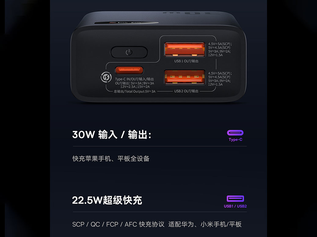 USB1/USB2Output: 4.5V/5A (SCP); 5V/4.5A (SCP); 5V/3A; 9V/2A; 12V/1.5A