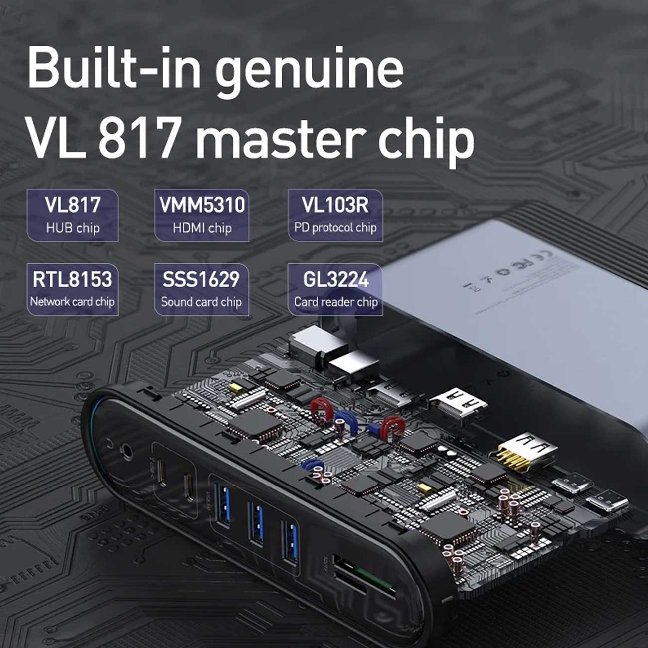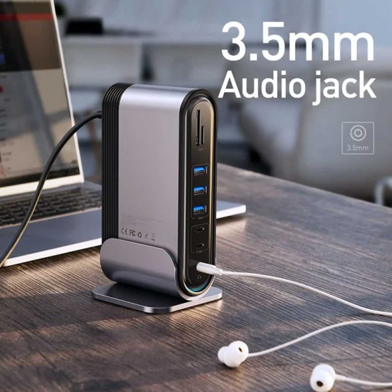 به طور کلی تعداد 17 پورت در مجموع روی این هاب قرار داده شده است که شامل درگاه های: HDMI ، USB3.0 ، USB2.0 ، RJ45 ، Type-C ، TF ، SD ، AUX و DC هستند و بنا به نیاز خود می توانید از آن ها استفاده نمایید. تعداد 3 پورت HDMI روی این هاب قرار دارد که می توانید با استفاده از آن یک تصویر را روی چند نمایشگر داشته باشید و تنها به یک صفحه محدود نشوید.
