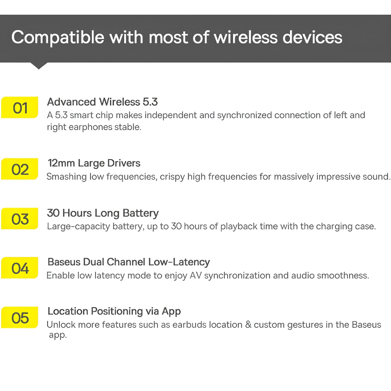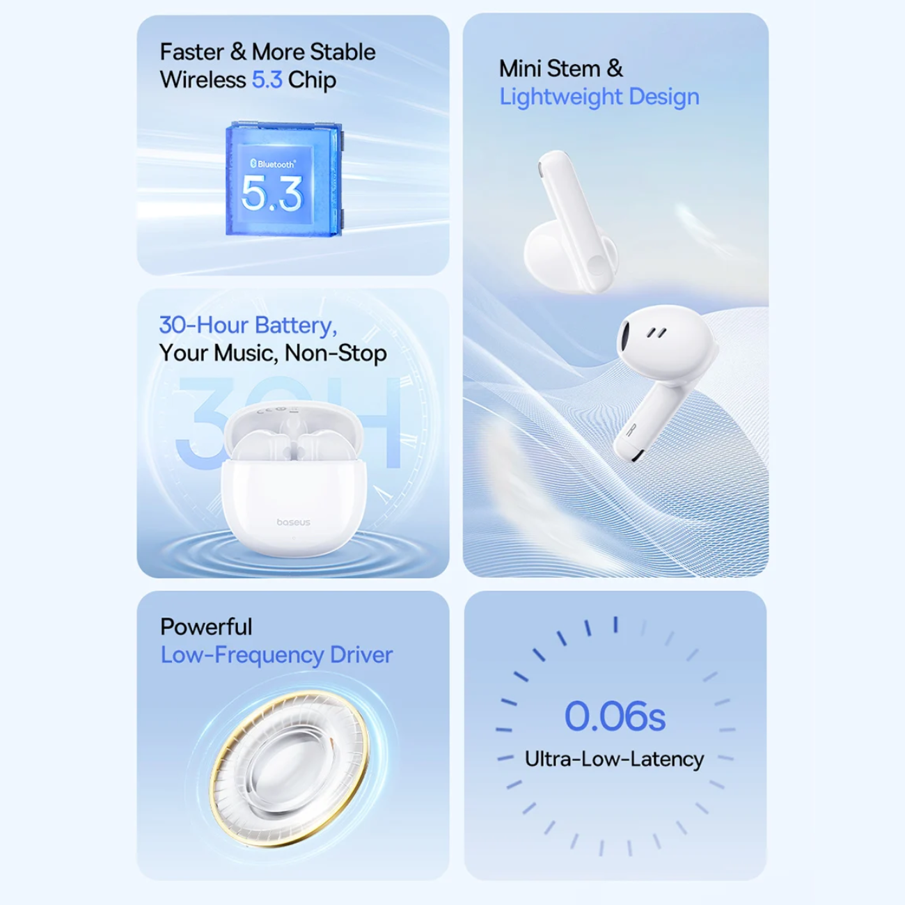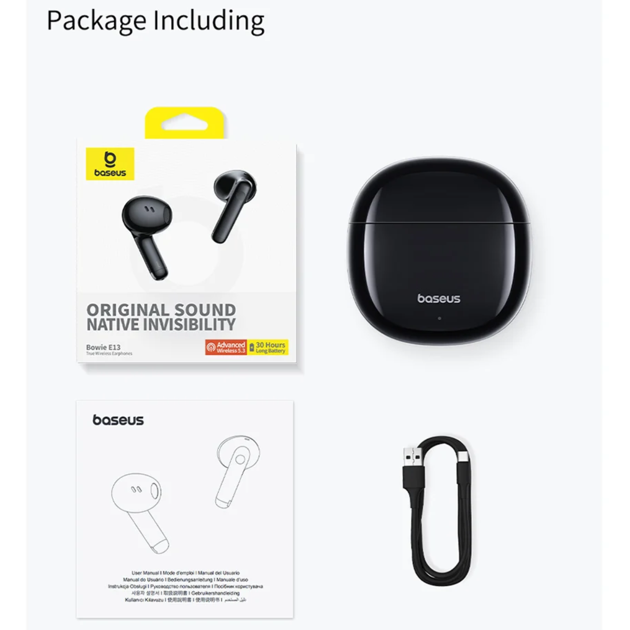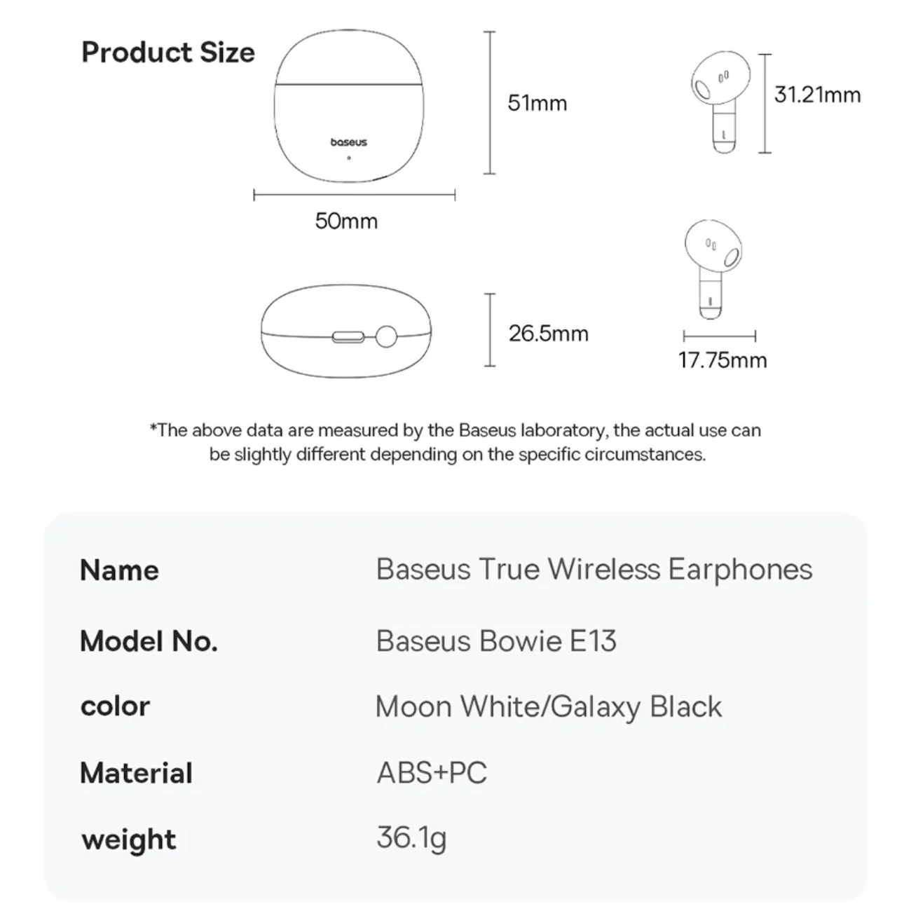 هندزفری بیسیم Baseus Bowie E13 دارای دیافراگم با روکش تیتانیوم با درایورهای بزرگ 12 میلیمتری است که صدای باکیفیت را با باس عمیقتر در لایههای میانی طوری تنظیم میکند که برای گوش بسیار مناسب خواهد بود.