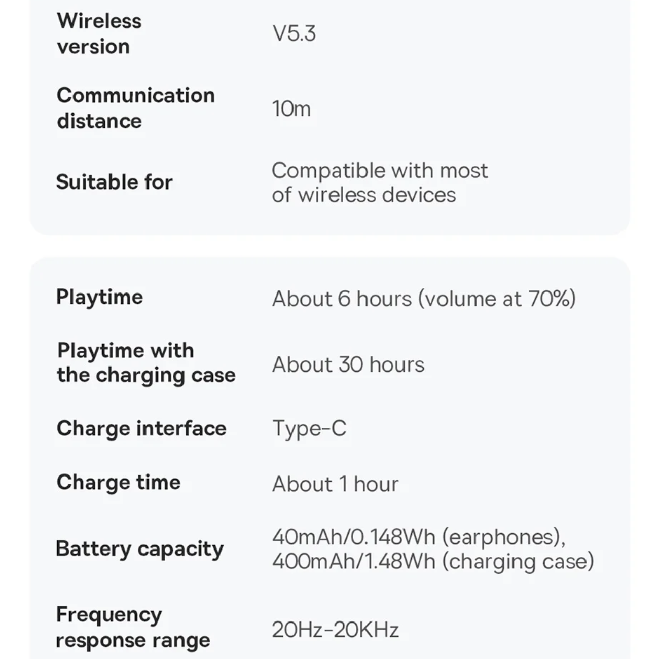 | سایر قابلیت ها | - تأخیر کم 0.06 میلیثانیه - قابلیت شارژ سریع - دیافراگم با روکش تیتانیوم - طراحی کاملا ارگونومیک و متناسب با گوش - زاویه پوشش 45 درجه برای انتقال صدای واضح - درایورهای بزرگ 12 میلیمتری - طراحی مینی استیم سبک - پشتیبانی از اپلیکیشن - ورودی هدفون: DC 5V-80mA - ورودی نامی کیس شارژ: DC 5V-520mA - مصرف جریان نامی هدفون: 6.5 میلی آمپر - مصرف جریان نامی کیس شارژ: 270 میلی آمپر |
