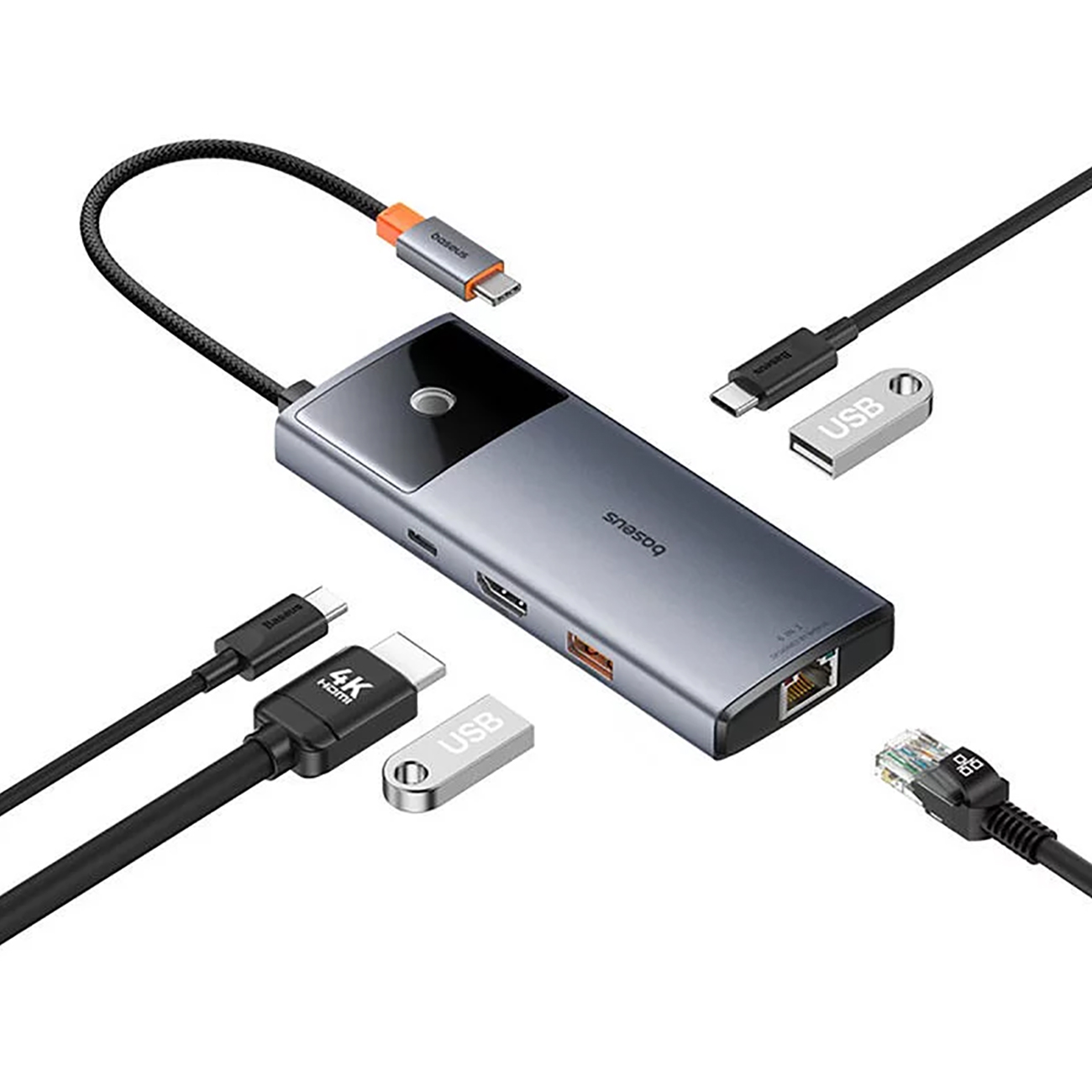 هاب مک بوک تایپ سی 6 پورت بیسوس مدل BS-OH099 از 6 پورت کاربردی تشکیل شده است. پورتهایی نظیر یک درگاه HDMI / یک درگاه Type-C / دو درگاه USB 3.0 / یک درگاه USB-C PD / یک پورت Ethernet RJ45 در این هاب تعبیه شده و امکانات قابل قبولی را در اختیار کاربر قرار میدهد: