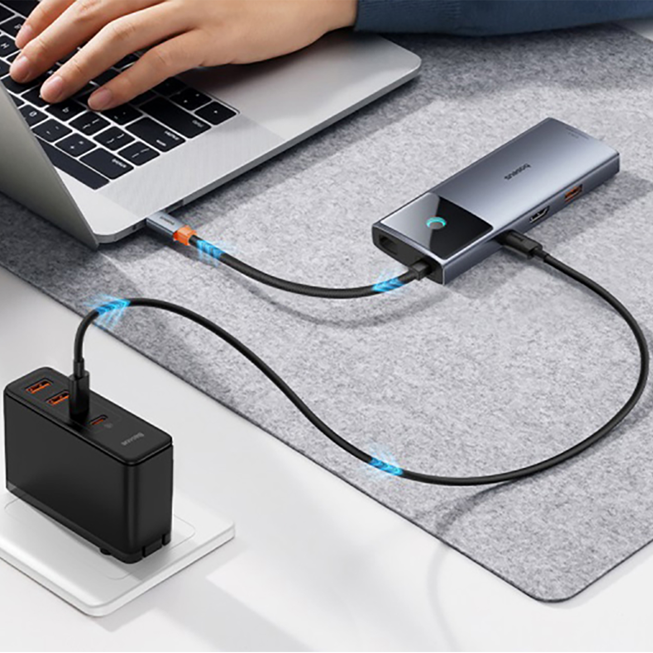 Baseus BS-OH099 Metal Shimmer Series 2 6-in-1 USB HUB Docking Station یک هاب قدرتمند است که نه تنها به شما امکان میدهد اسناد را روی پروژکتور نمایش دهید، دادهها را با سرعت 10 گیگابیت بر ثانیه انتقال دهید، به موسیقی گوش دهید، بلکه تلفن یا لپ تاپ خود را تا 100 وات شارژ کنید. BCT پیشرفته (تکنولوژی خنک کننده Baseus) تضمین میکند که دستگاه کاملاً خنک شده و شارژ آن ایمن است. پورتهای USB-C و USB-A با فناوری USB3.2 Gen 2 سازگار شدهاند که امکان انتقال دادهها را با سرعت بالا فراهم میکند.