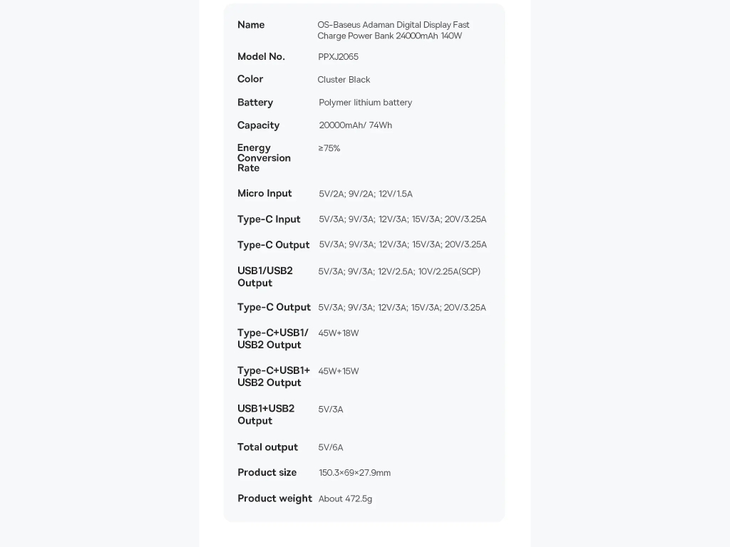 | توان خروجی | Type-C1 Output: 5V/3A; 9V/3A; 12V/3A; 15V/3A; 20V/5A;28V/5A Type-C Output: 5V/3A; 9V/3A; 12V/2.5A; 15V/2A USB Output: 5V/3A; 9V/3A; 12V/2.5A; 10V/2.25A(SCP) |