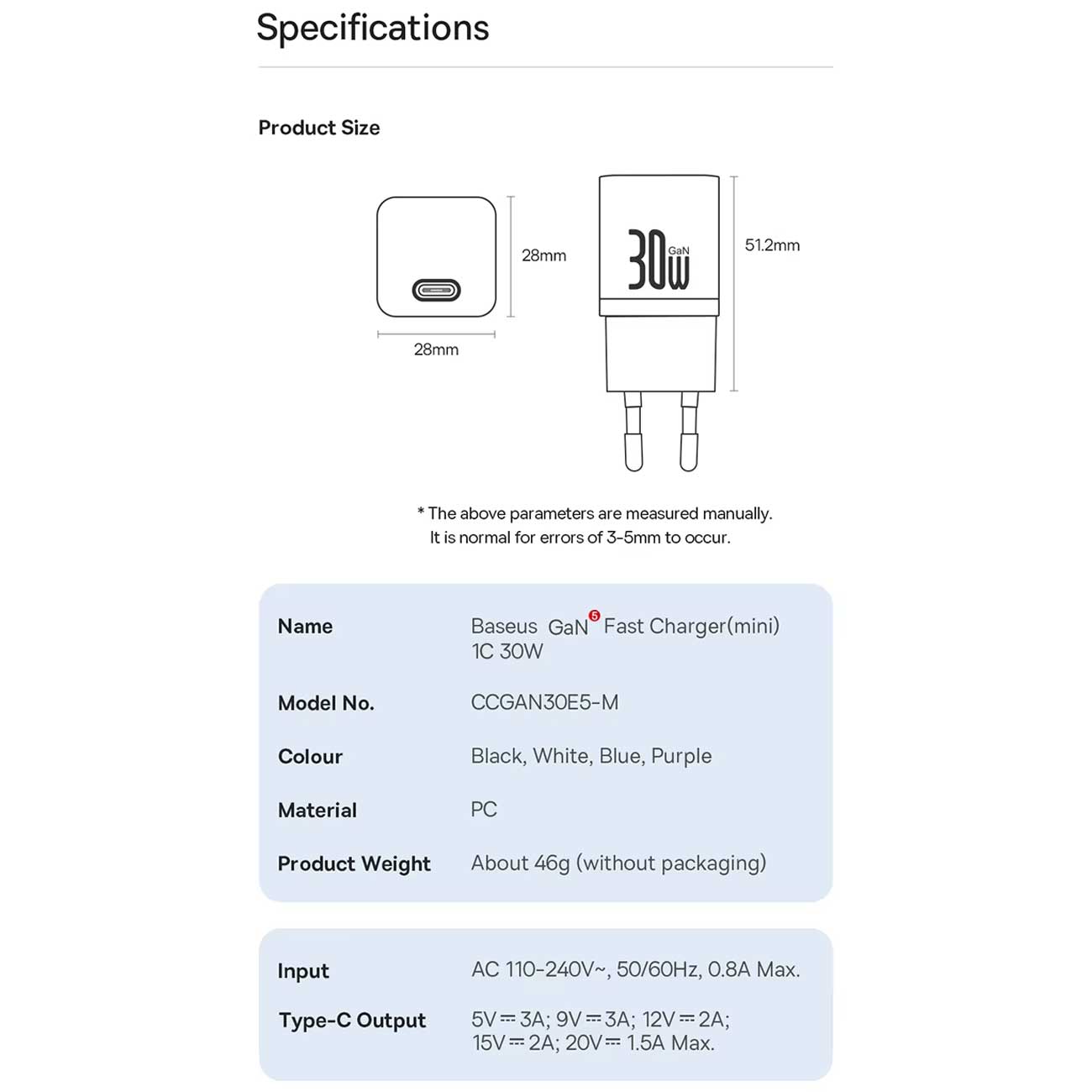 Baseus 30W GaN5 Fast Charger mini 1C CCGAN30E5-M BS-CCGN070401