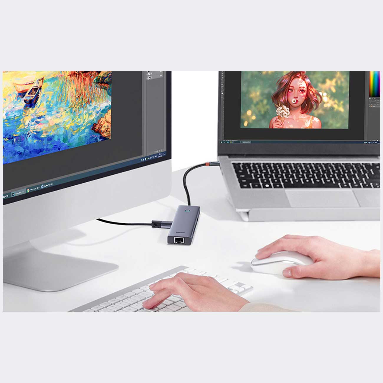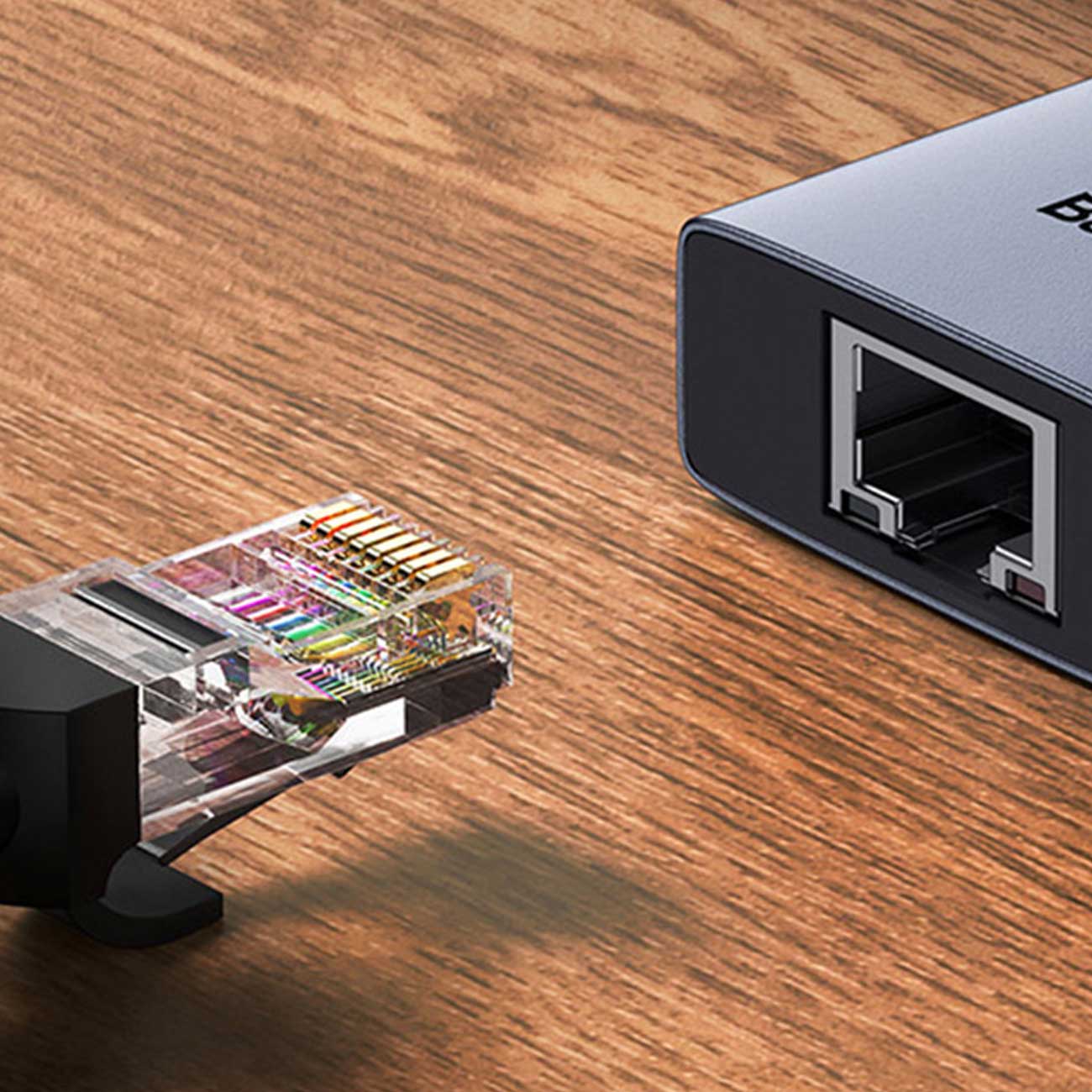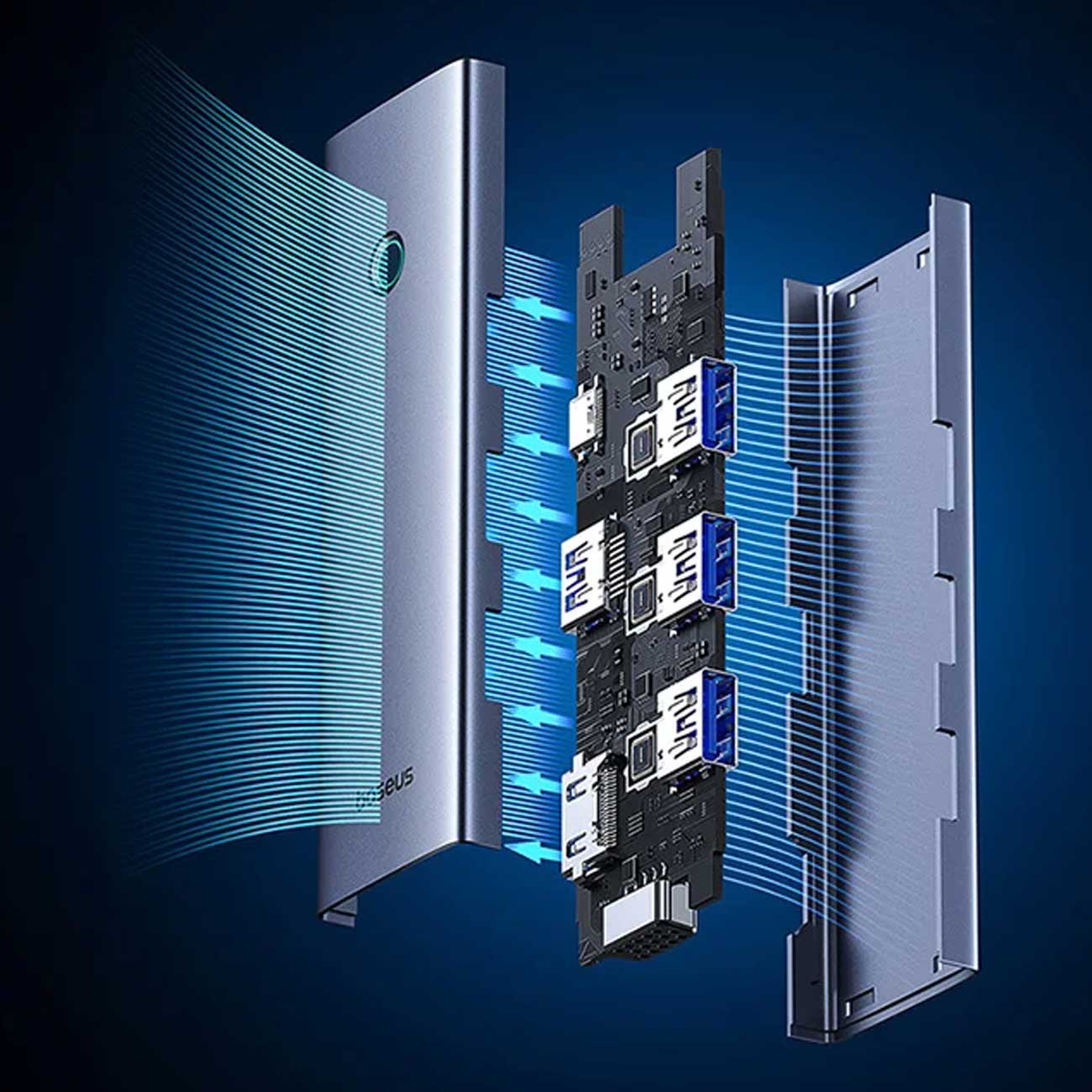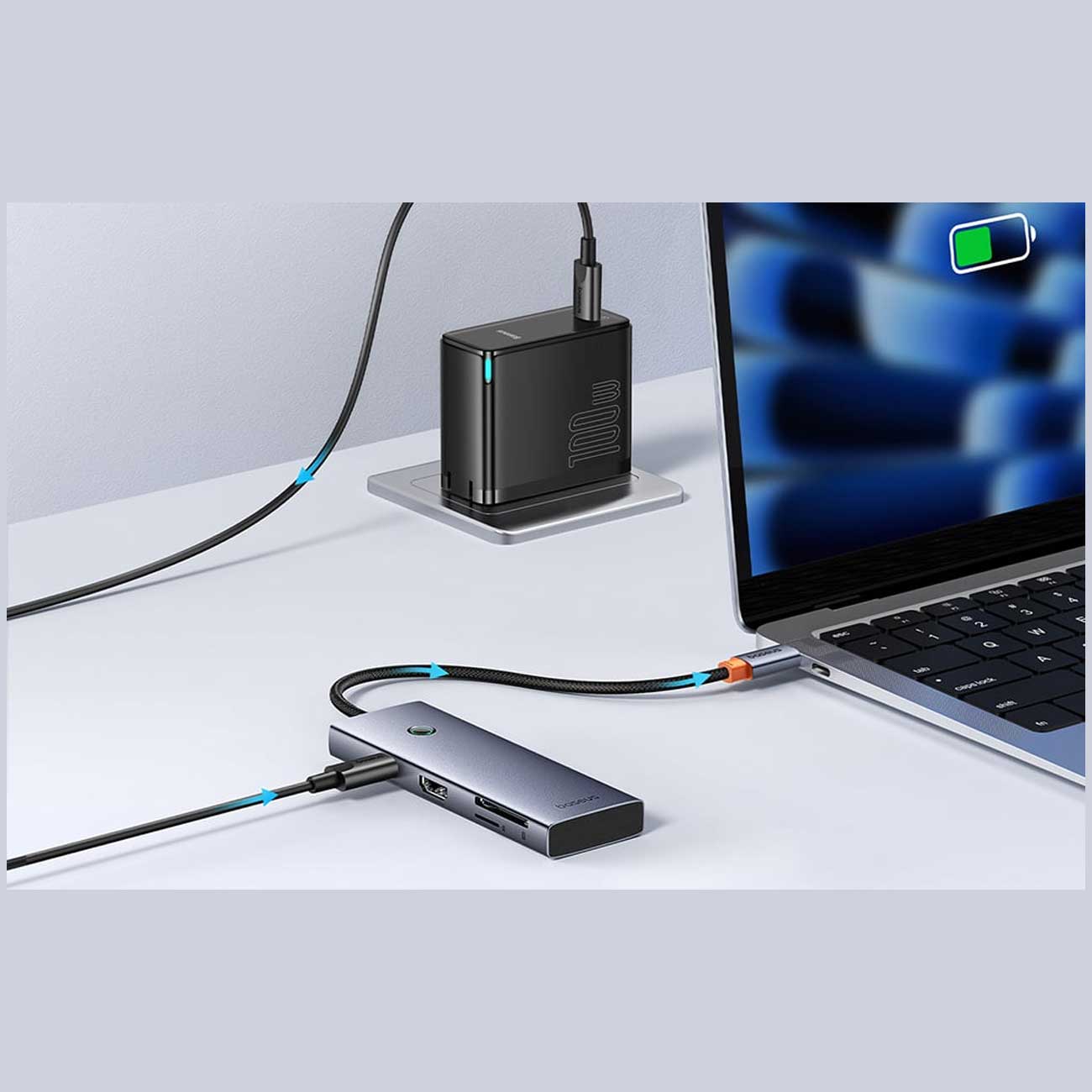 پورت تایپ سی: علاوه بر این قابلیتها، هاب به شما امکان میدهد با استفاده از قدرت PD3.0 100W درگاه تایپ سی لپتاپها را به سرعت شارژ کنید.