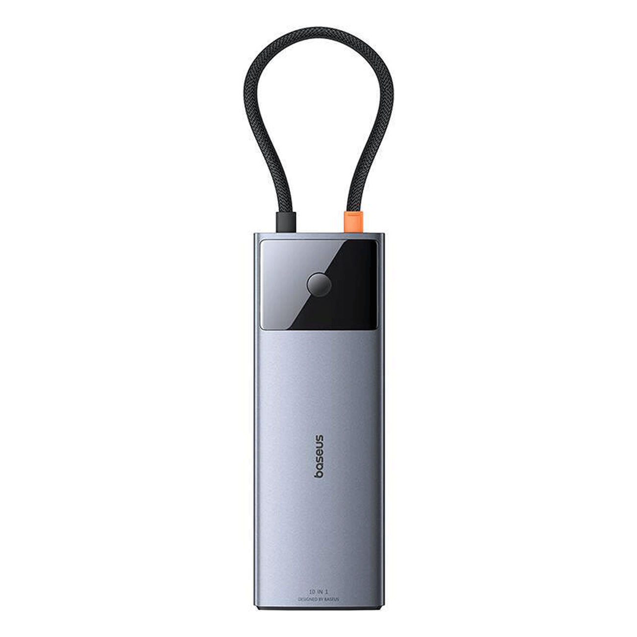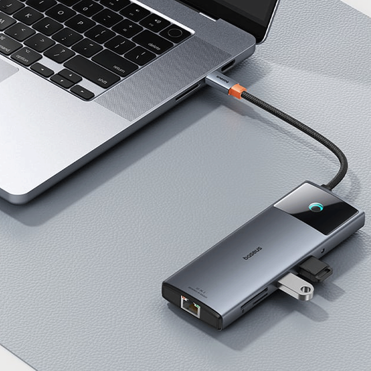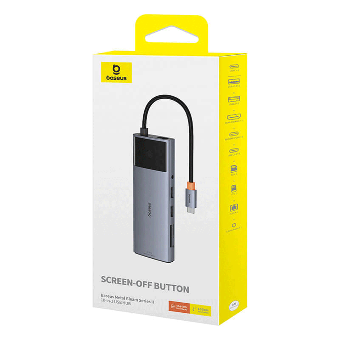 Baseus Metal Gleam Series II دارای یک صفحه نمایشگر است که اطلاعات انتقال را به شما نمایش میدهد؛ در مواقعی که نیاز دارید کسی صفحه دکستاپ شما را نبیند روی صفحه نمایش یک کلید وجود دارد که با فشردن آن بدون اینکه بخواهید هاب را جدا کنید صفحه دکستاپ را خاموش خواهد کرد.