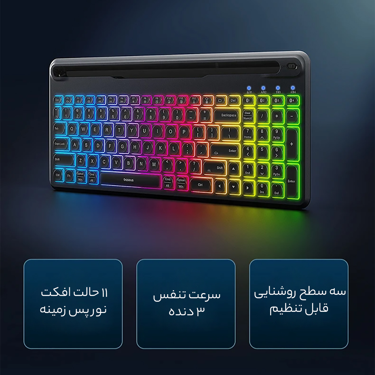 صفحه کلید بیسیم فوق نازک Baseus BS-K03 B00955505112 از 11 حالت نورپردازی RGB پشتیبانی میکند. هر حالت را میتوان با توجه به سبکهای مختلف در هنگام بازی و یا تایپ کردن در فضای تاریک از نظر سرعت و میزان روشنایی تنظیم کرد.