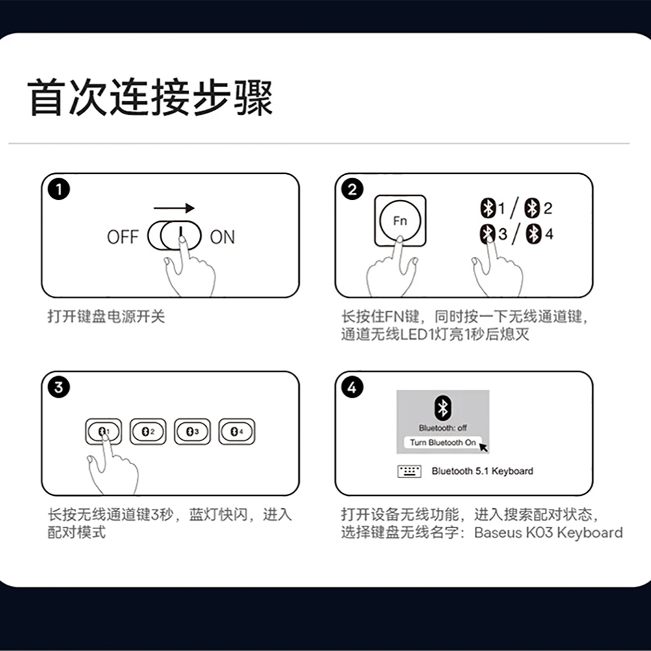 چهار دستگاه شامل گوشی همراه، تبلت و لپ تاپ به طور همزمان به کیبورد بیسوس K03 متصل میشوند و با استفاده از یک کلید میتوان بین دستگاهها سوییچ کرد. بنابراین این قابلیت کیبورد Baseus K03 نیاز به جفت شدنهای مکرر را از بین میبرد.