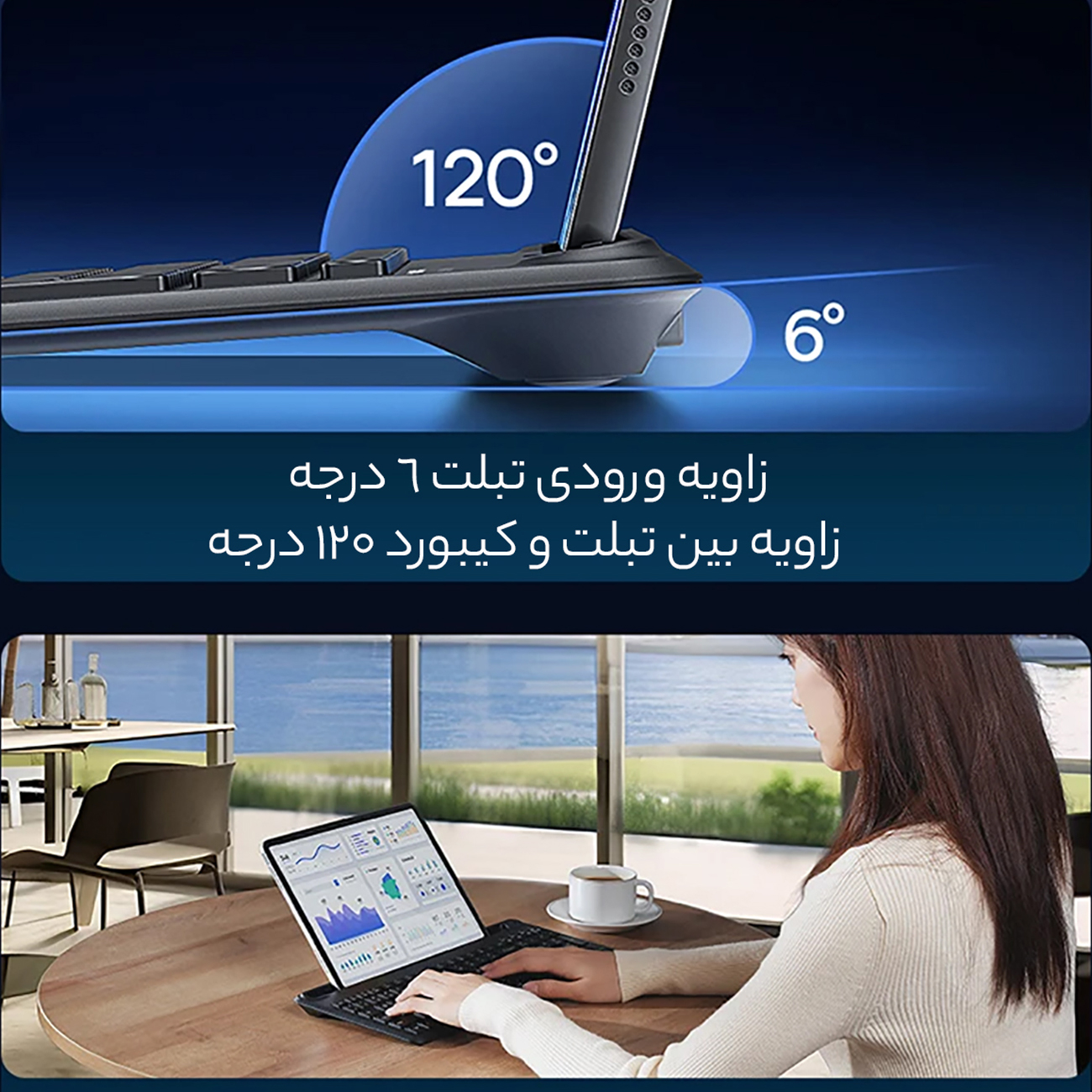 این محصول دارای جایگاهی برای قرار دادن تبلت است و تبلتهای تا اندازه 11 اینچ را بدون مسدود کردن صفحه نمایش پشتیبانی میکند. زاویه ورودی تبلت 6 درجه و زاویه بین تبلت و کیبورد 120 درجه است.بنابراین طراحی کیبورد Baseus K03 برای زوایای چشم و دست ارگونومی و مناسب کار طولانی مدت بدون احساس خستگی است.