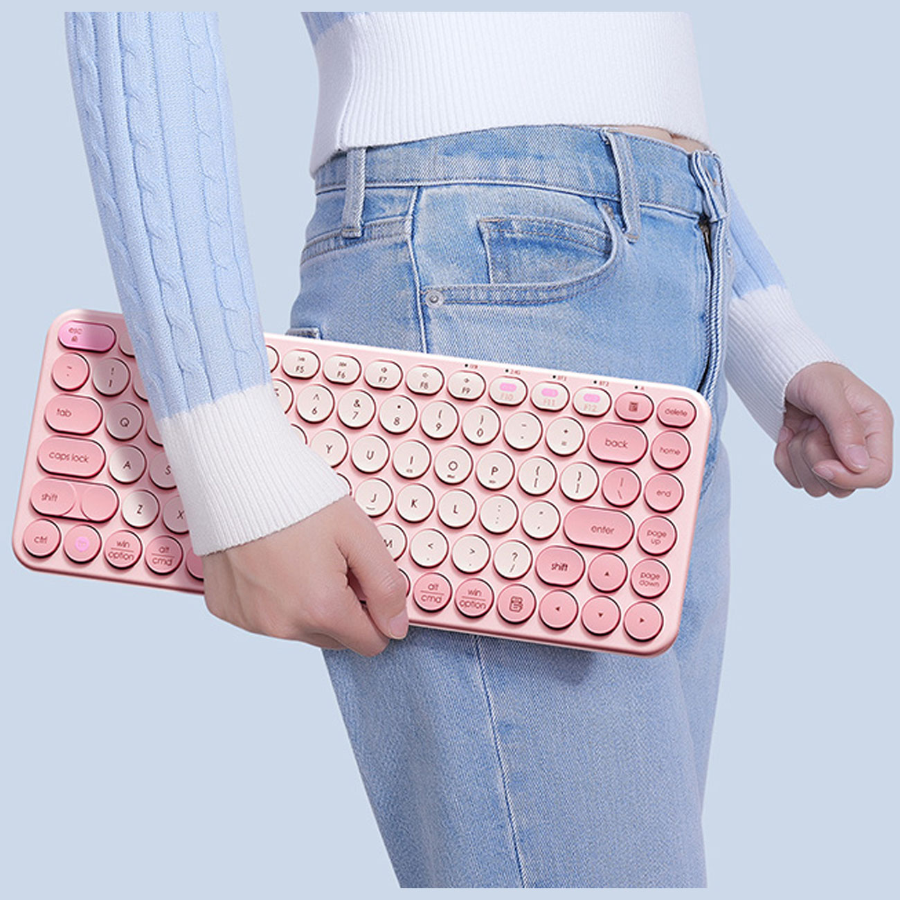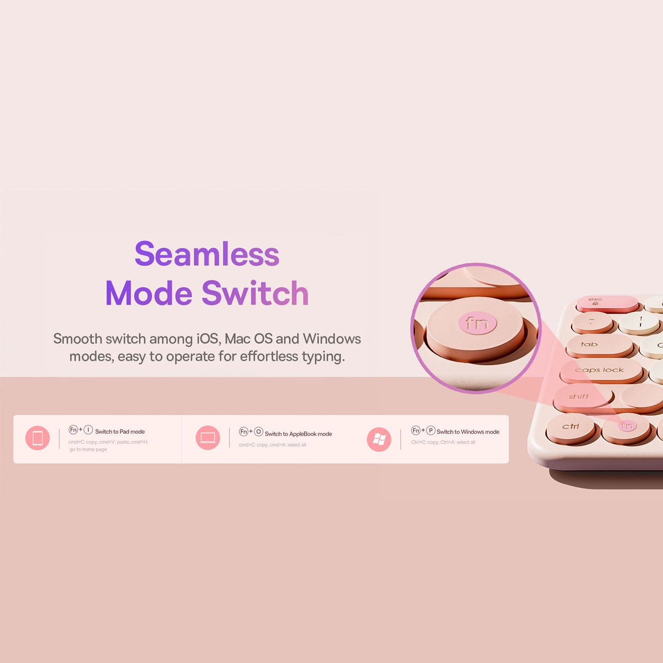 کیبورد بی سیم بیسوس با اتصال سه حالته میتواند به 3 دستگاه همزمان متصل شود؛ برای جا به جایی بین این دستگاه ها کلید FN را فشار دهید.