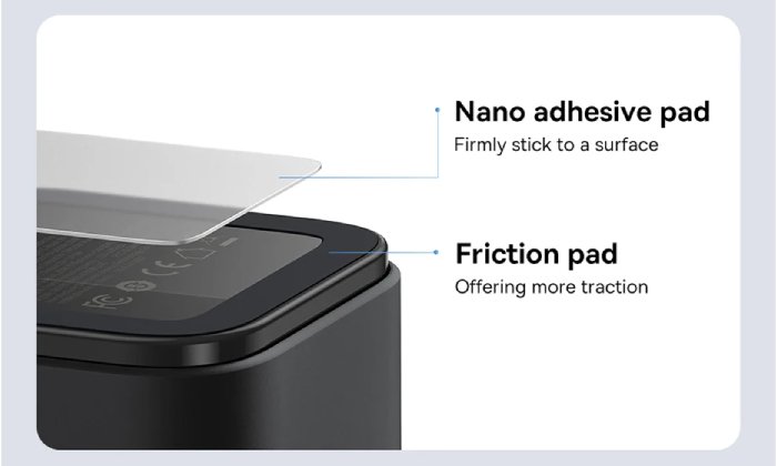 همراه محصول یک عدد پد چسب نانو وجود دارد که شما میتوانید آن را در قسمت زیرین شارژر قرار دهید و شارژر را محکم به سطوح بچسبانید و از لغزش و جابهجایی آن در هنگام استفاده جلوگیری کنید، این پد چسب با فناورری نانو ساخته شده که قابلیت استفاده مجدد را دارد، بدون اینکه از خاصیت چسبندگی آن کم شود.