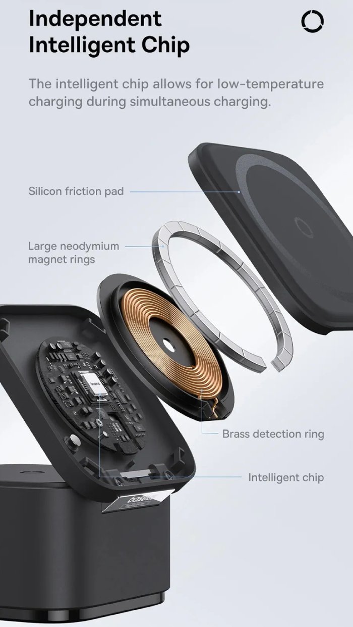 بیسوس برای جلوگیری از داغ شدن این شارژر وایرلس از تراشه هوشمندی استفاده کرده که امکان شارژ در دمای پایین را هنگام شارژ همزمان فراهم میکند.