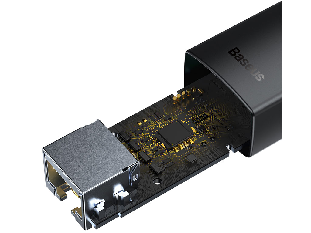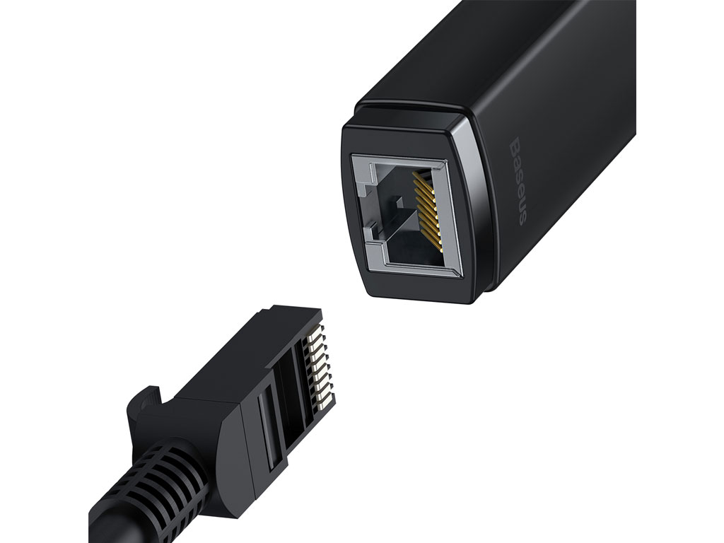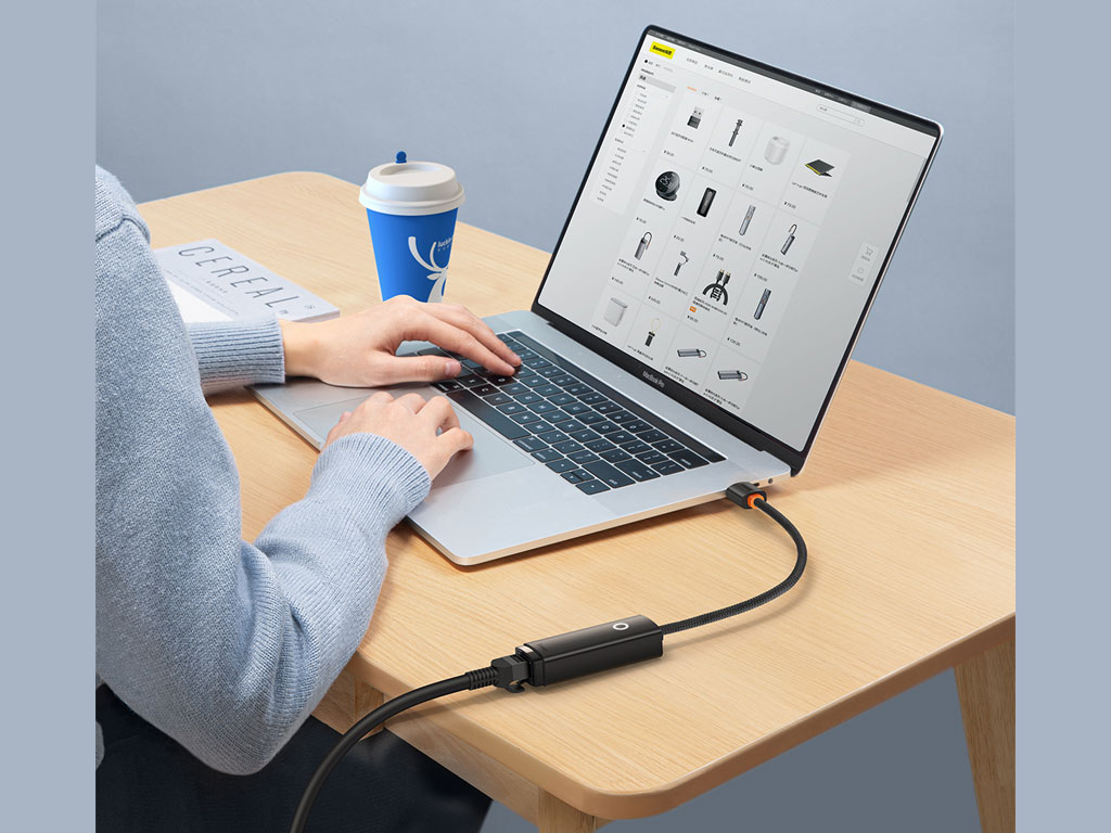 با وجود کابل شبکه بیسوس به راحتی میتوانید یک شبکه را به لپتاپ یا کامپیوتر خود متصل کنید. در کابل WKQX000201 بیسوس یک پورت Type-C طراحی شده و از طریق آن امکان اتصال برای شما فراهم است؛ حتی اگر درگاه اتنرنت روی دستگاه شما وجود نداشته باشد هم به راحتی میتوانید با کمک این کابل اتصالی سریع به اینترنت را برقرار کنید و از انتقال سریع فایل های ویدئویی، صوتی و گرافیکی بین ایستگاه کاری و شبکه خود لذت ببرید. سر دیگر مبدل درگاه RJ45 است و با وجود گیرههای مقاومی که درون آن مشاهده میکنید کابل شبکه را به خوبی نگه میدارد و با تکان و حرکت هم کابل از جای خود خارج نمیشود.
