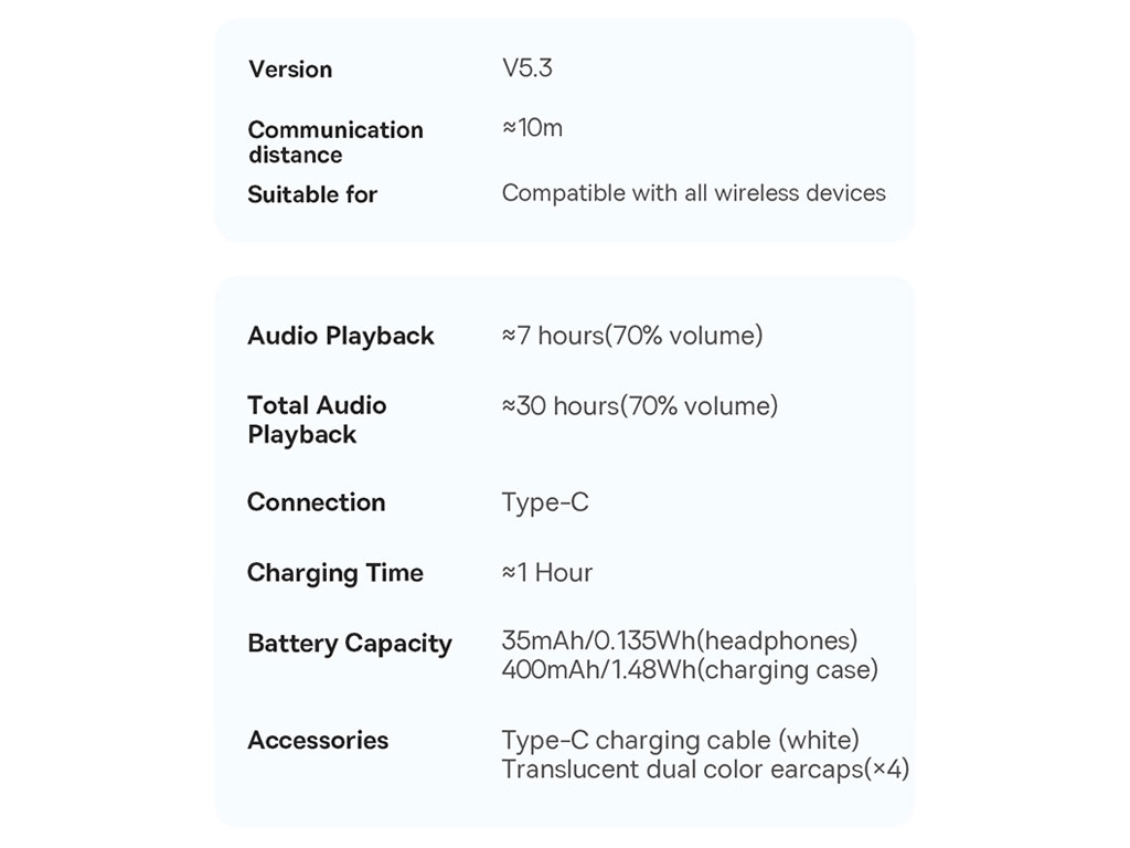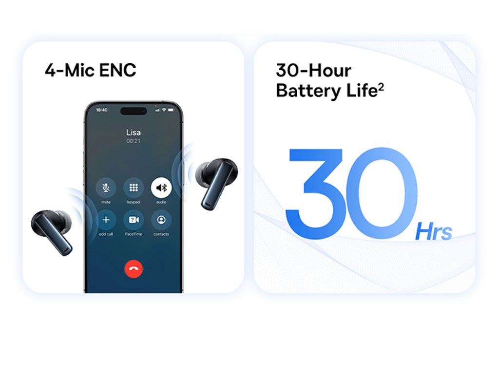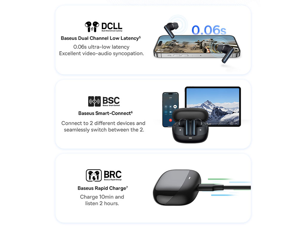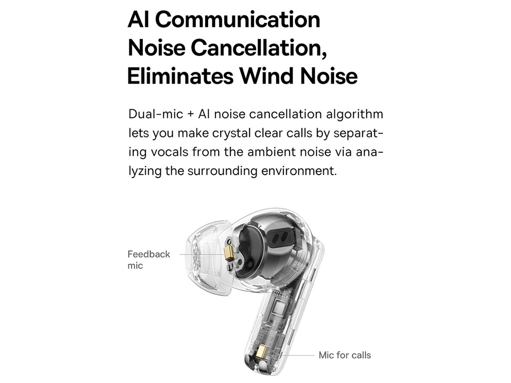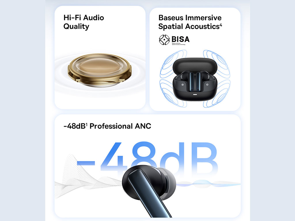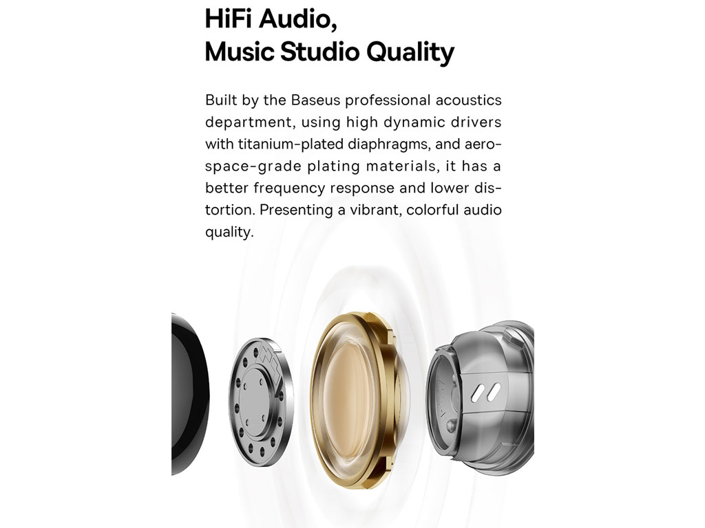 Baseus NGTW350101 دارای دیافراگم 13 میلیمتری بوده؛ و از کدک AAC پشتیبانی میکند؛ بنابراین صدایی با کیفیت HiFi و دقت بالا را ارائه میدهد. در ضمن از حداکثر عمق حذف نویز 42 دسیبل پشتیبانی میکند و به خوبی میتواند صداهای محیط مانند آواز و حتی صدای باد را حذف کند.