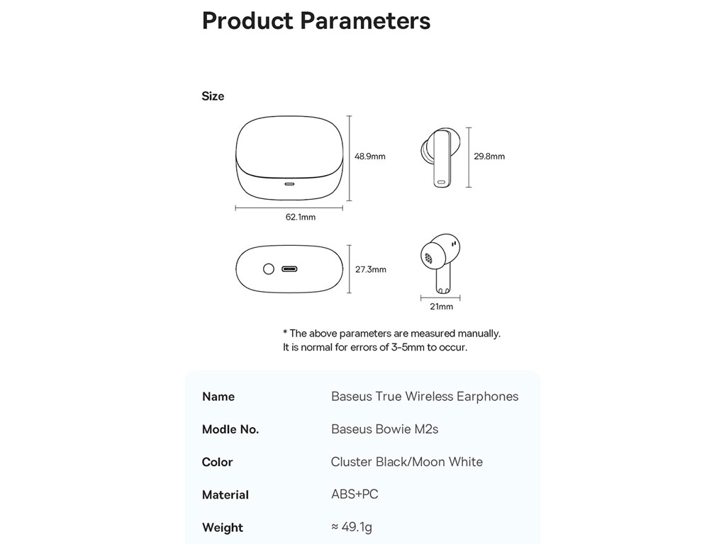 اندازه گوشیها 29.8*21 میلیمتر است و آنها هم دارای چراغ نشانگر باتری آبی رنگ هستند؛ با داشتن کلاهک سیلیکونی به خوبی درون گوشها فیکس میشوند و هنگام تحرک هم از جای خود تکان نمیخورند و به کاهش صداهای اضافه اطراف هم کمک میکنند. بیسوس همراه این محصول سریهای سیلیکونی در سه سایز مختلف ارائه کرده تا سری متناسب با گوشتان را استفاده کنید. در ضمن وقتی قرار است فرد دیگری هم از هندزفری شما استفاده کند برای جلوگیری از انتقال عفونت گوش میتوانید سری را عوض کنید.
