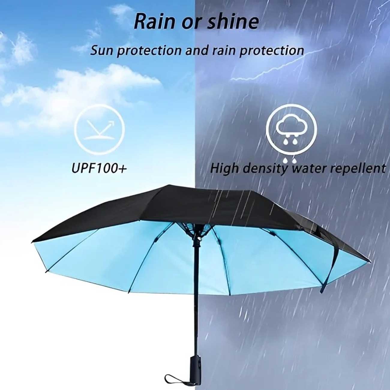 چتر دومنظوره دارای پارچه پونجی 190T با پوشش نقرهای UV است که از پوست شما در برابر اشعههای مضر UV خورشید محافظت میکند. این پوشش نقرهای باعث میشود که چتر علاوه بر محافظت در برابر باران، سایهای دلپذیر و محافظت شده از نور خورشید نیز ارائه دهد.