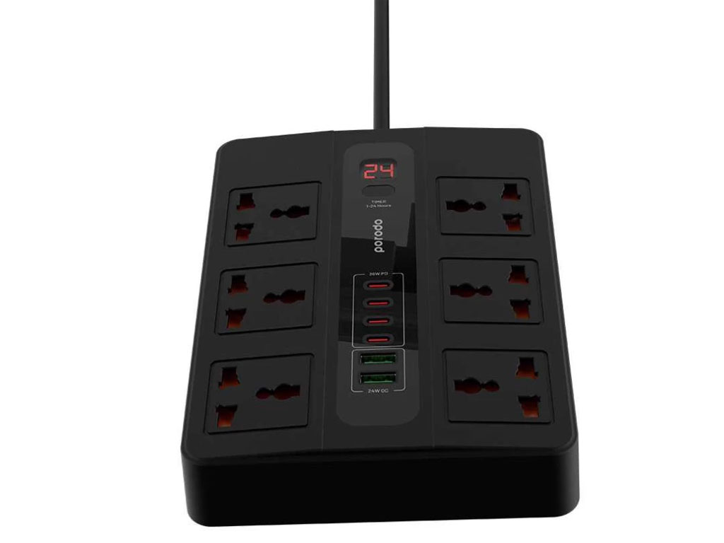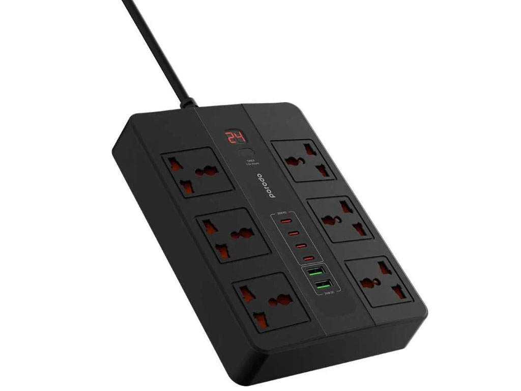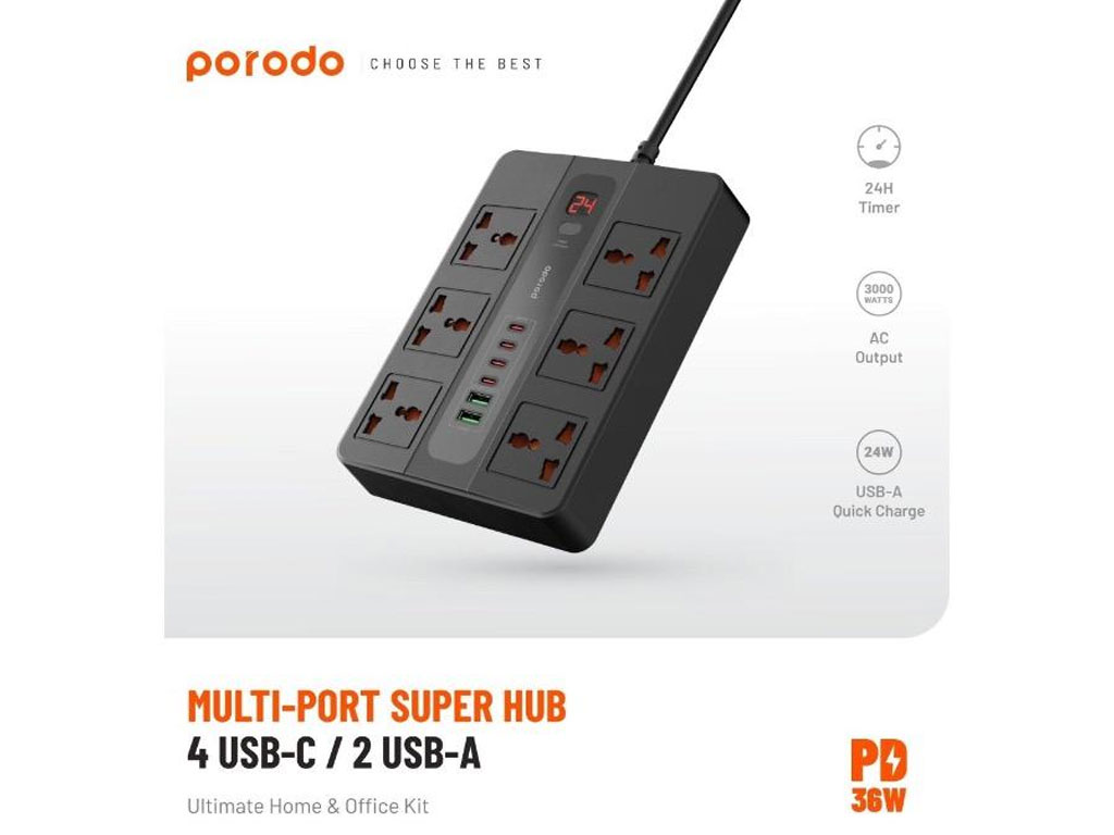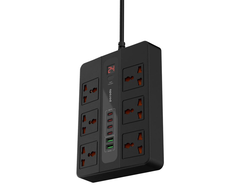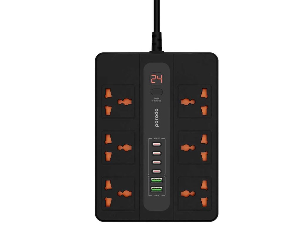 چند راهی برق 6 سوکت 3000 وات، 2 یو اس بی 24 وات و 4 تایپ سی 36 وات 3 متری پورودو Porodo 6AC 2USB-A & 4USB-C PD Multi-Port UK PD-FWCH009-3M-BK
