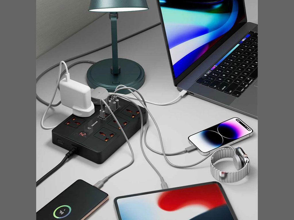 این چندراهی با داشتن 6 پریز برق AC و 2 پورت USB و 4 درگاه Type-C قادر به تامین برق 12 دستگاه به صورت همزمان است. با خرید چندراهی برق پورودو FWCH009 نیازی به داشتن آداپتورهای متفاوت برای شارژ کردن گوشیهای همراه یا دیگر لوازمهای برقی نخواهید داشت و این دستگاه به تنهایی قادر به تامین نیروی مورد نیاز همه دستگاههای برقی است. اما باید این نکته را متذکر شد که در صورت استفاده همزمان از تمامی درگاهها، جریان بین آنها تقسیم میشود.