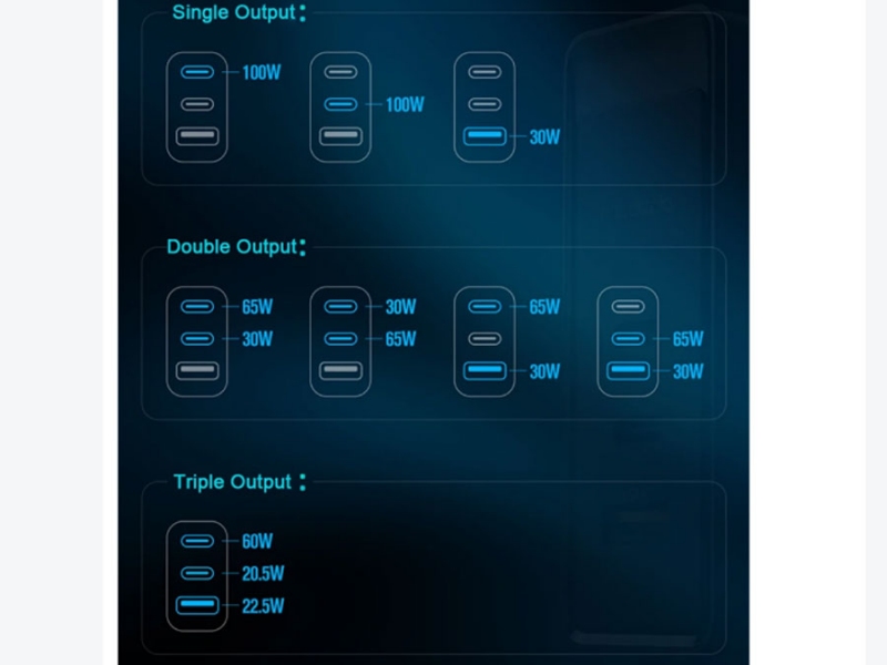 | ولتاژ خروجی | 3.3-20V-3A, 5V-3A, 9V-3A, 12V--3A, 15V--3A, 20V-5A 100W Max:خروجی USB-C1/USB-C2 4.5V-5A, 5V-4.5A, 9V-2.5A :خروجی USB-A 65W+30W or 30W+65W (95W Max.) : خروجی USB-C1+USB-C2 65W+30w(95W Max.) : خروجی USB-C1/C2+USB-A USB-C1 (60W) +USB-C2 (20W) +USB-A(22.5W) : خروجی USB-C1+USB-C2+USB-A 5V-3A, 9V=2.22A, 12V-1.67A : خروجی USB-C2 |