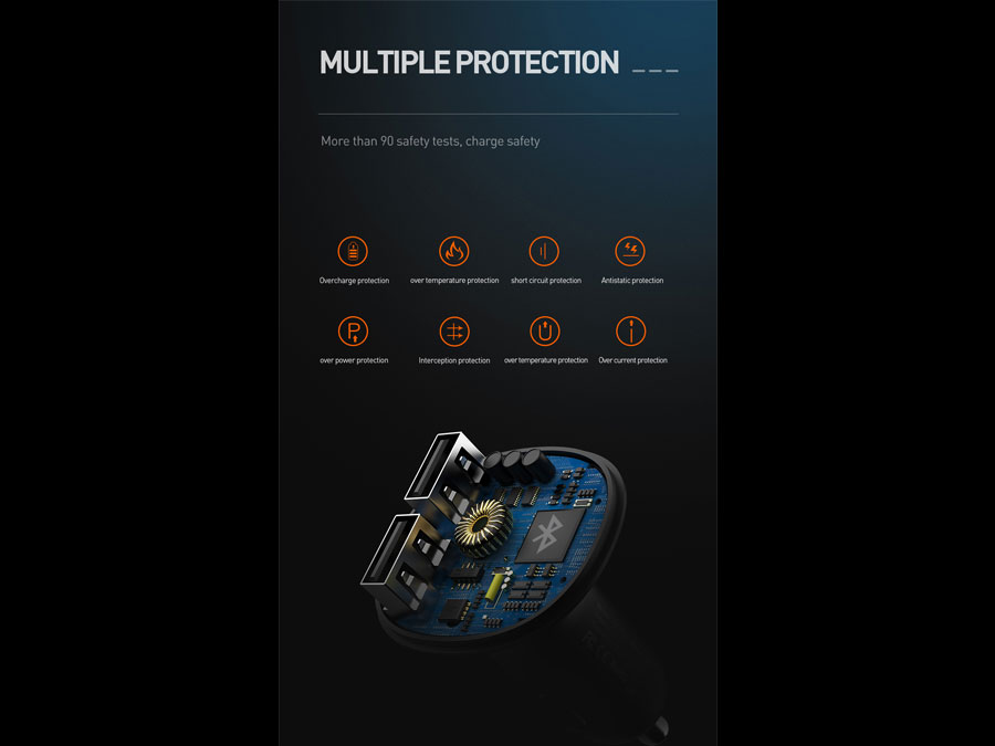 بیش از 90 تست ایمنی روی این شارژر موبایل داخل ماشین آزمایش شده و ایمنی کامل باتری دستگاه شما را در برابر آسیبهایی همچون اتصال کوتاه، دمای بالا، قدرت بیشازحد و ... تضمین میکند.