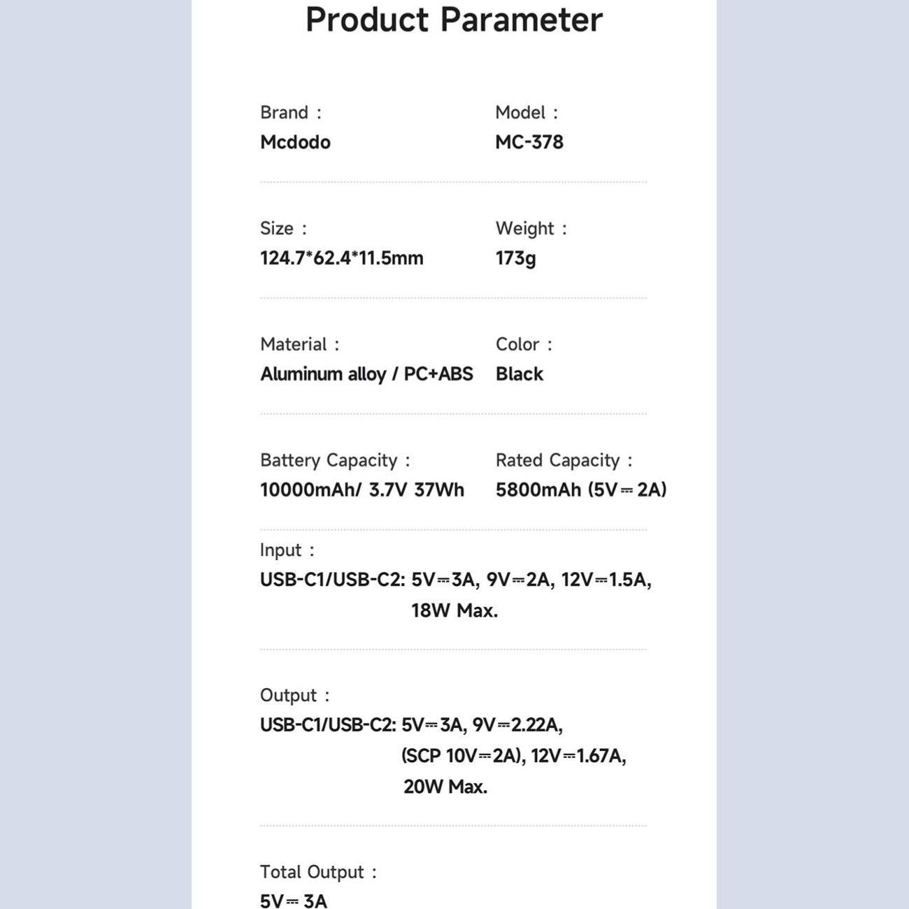 Output: USB-C1/USB-C2: 5V=3A, 9V=2.22A, (SCP 10V=2A), 12V=1.67A, 20W Max.