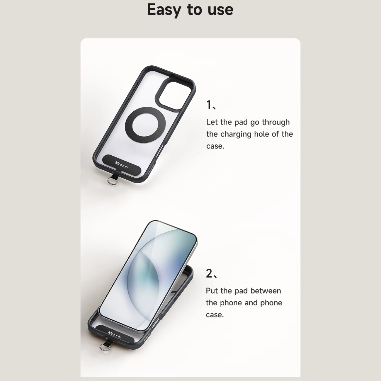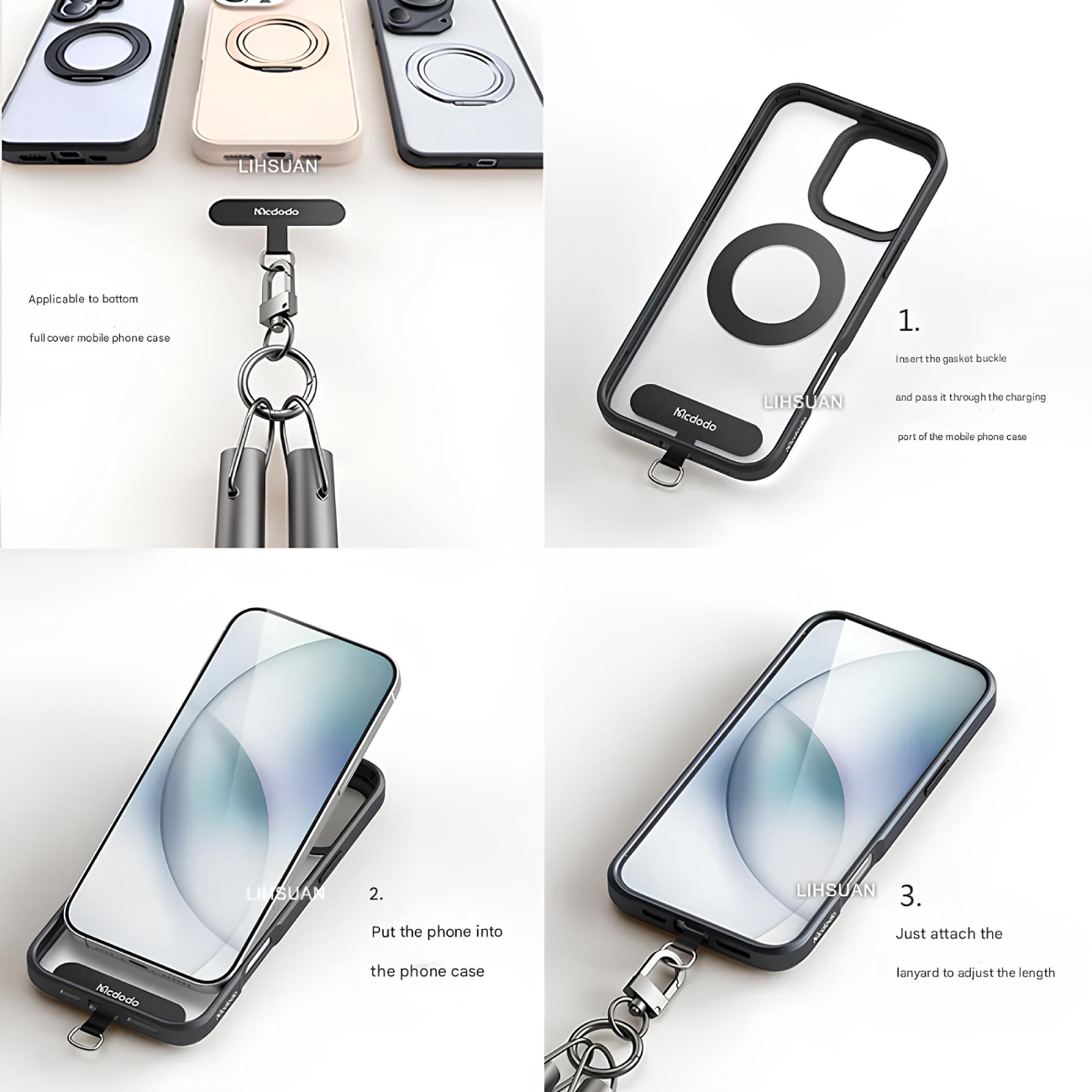 کابل و بند آویز مکدودو برای قابهای گوشی با پورت باز در پایین طراحی شده است. مراحل نصب آن نیز بسیار ساده است: