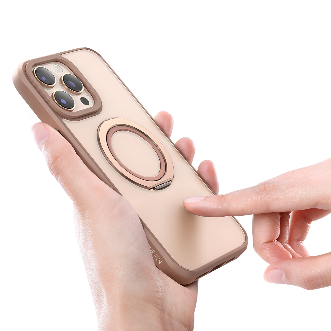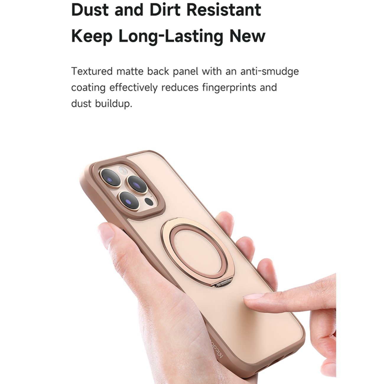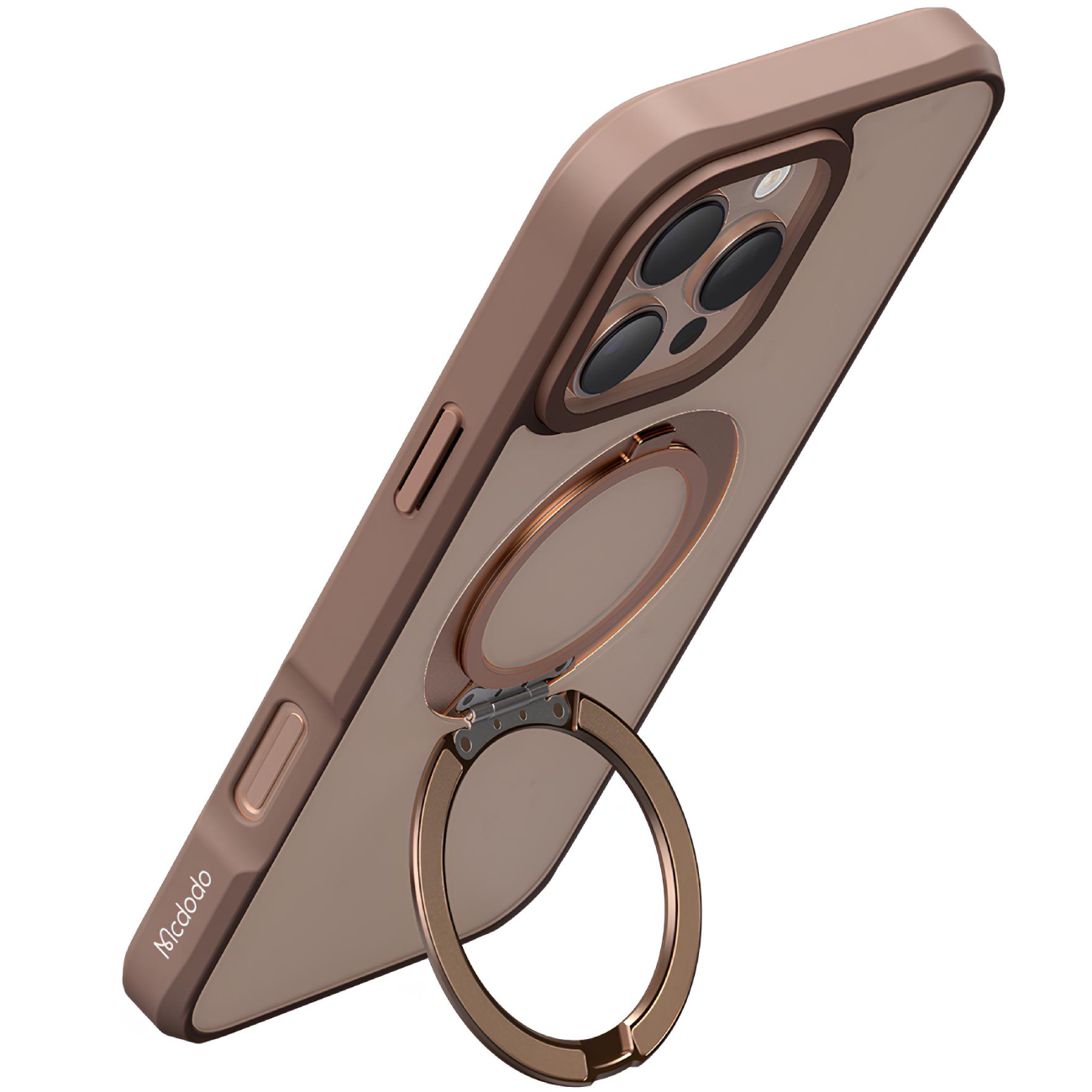 در پشت گارد مات مگنتی Mcdodo Magsafe Matte Case iPhone 16 Pro Max، یک استند فلزی تاشو وجود دارد که به عنوان یک حلقه نگهدارنده گوشی در دست و همچنین به عنوان یک هولدر موبایل رومیزی برای تماشای ویدیو، فیلم، سریال، کارتون، چت کردن و غیره قابل استفاده است. همچنین، قابلیت چرخش 360 درجه این قاب به شما این امکان را میدهد که در هر زاویهای که بخواهد، از تلفن خود استفاده کنید. این ویژگی به ویژه در هنگام برقراری تماس و یا عکاسی بسیار کاربردی است.